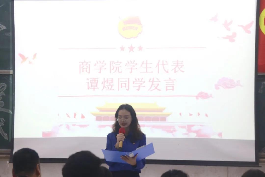 随后,学生代表团委学生副书记谭煜同学进行发言。她先以“疫”线青年志愿者为例,鼓励同学们积极投身于志愿服务活动,并提及发展之重任已落到当代青年肩上,同学们要抓住用好新形势下的新机遇。而青马工程培训正是同学们锻炼品格意志,提高工作水平和思想觉悟的大课堂,希望同学们可以认真学习,从中得到收获。