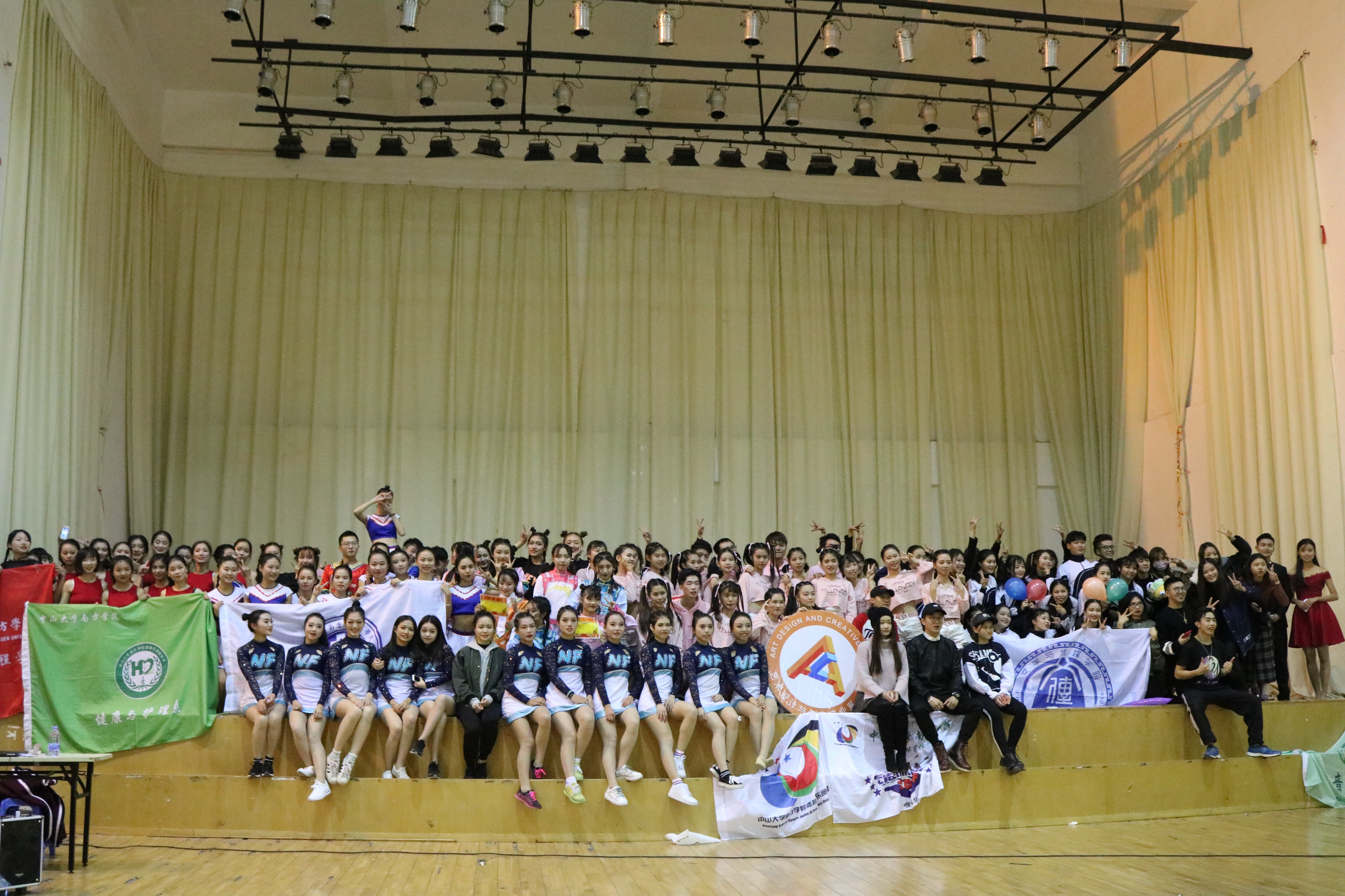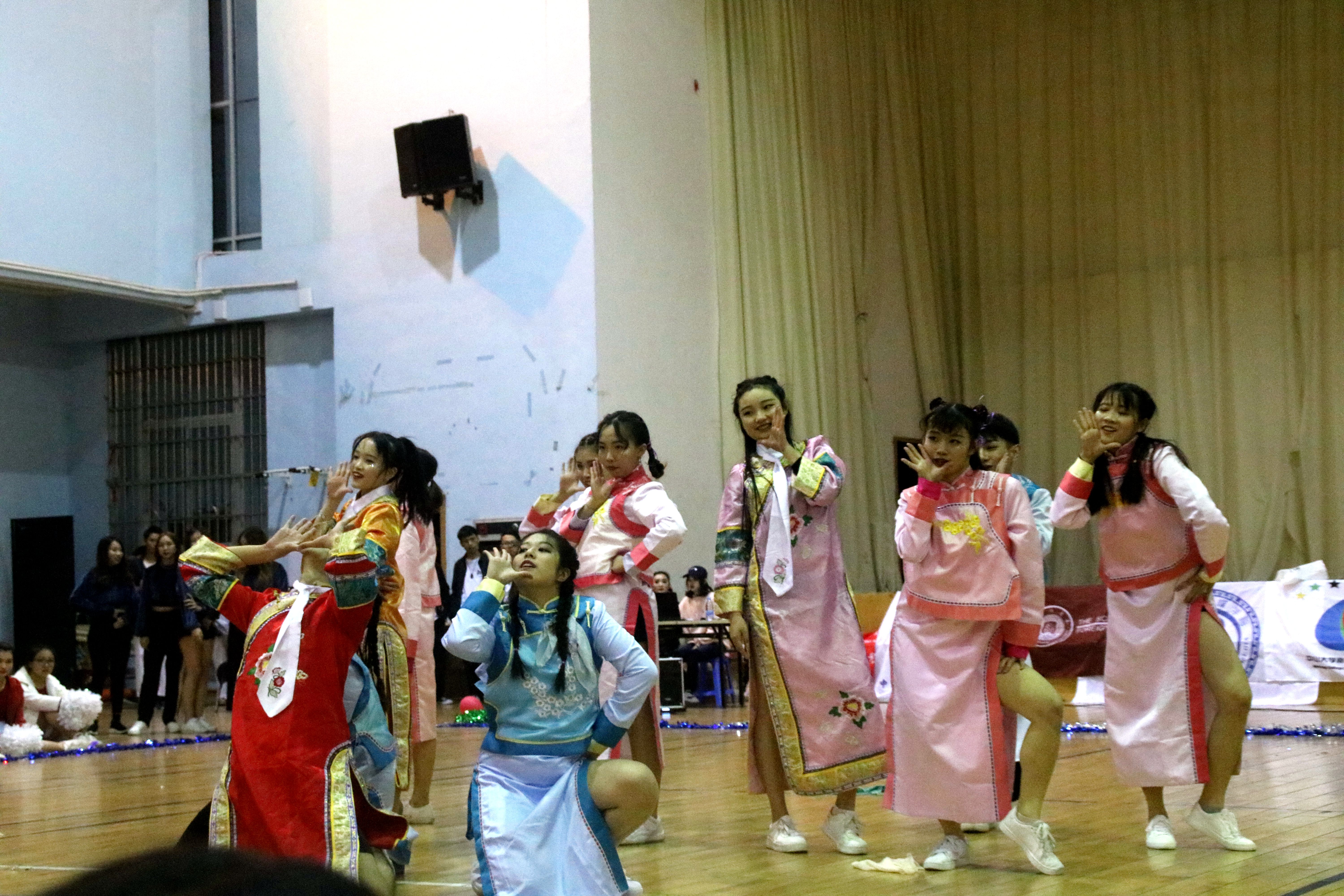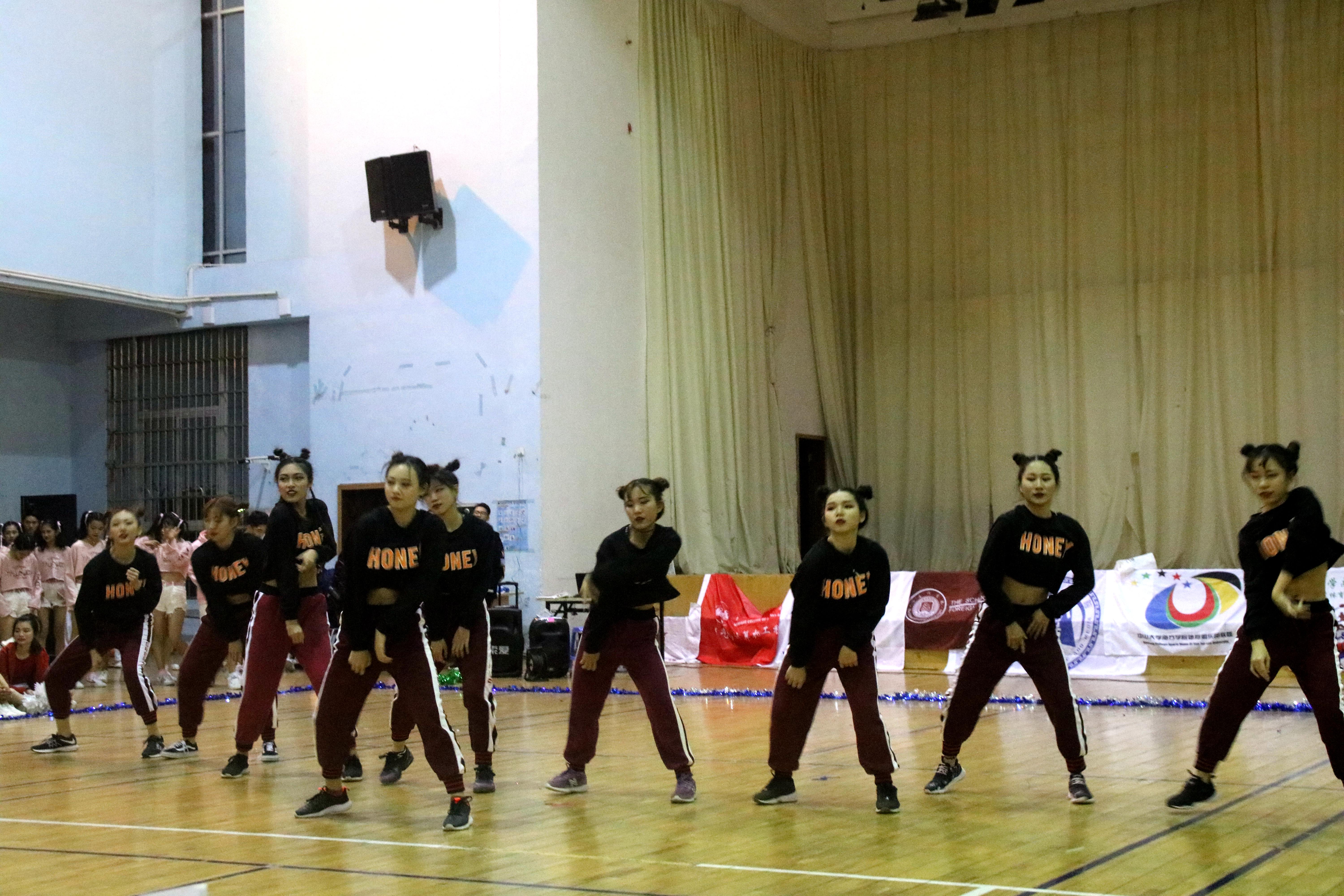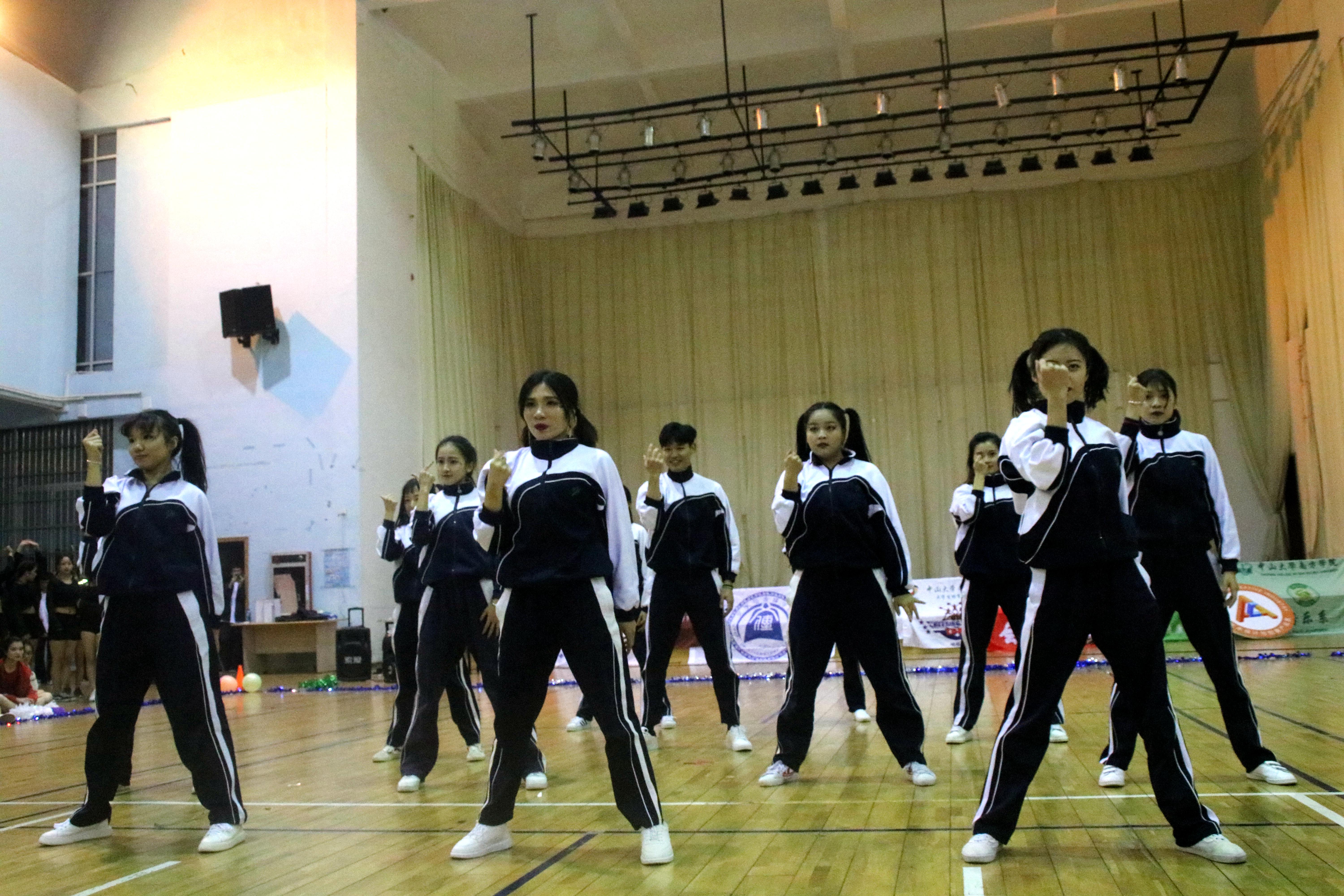在比赛中途,音响设备出现了一点小问题,但并没有由此浇灭了表演者与观众的热情,九大院系各支队伍的参赛人员身着动感服装闪亮登场,伴着动感音乐响起,精美的开场造型震惊全场,观众们都不禁为此欢呼呐喊。