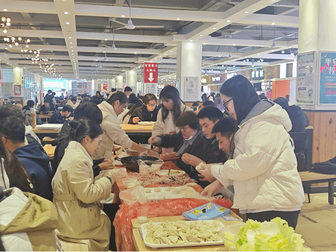 活动现场,食堂内欢声笑语,氛围温馨。一张张方桌旁,师生围坐一起,桌上摆放着各式各样的饺子馅料和工具,鲜嫩的猪肉、清新的白菜、香甜的玉米粒等,每一种食材都散发着诱人的香气。大家一边交流着学习、工作与生活中的趣事,一边动手包饺子,那一张张充满爱意的笑脸,共同构成了这个冬至最动人的画面。