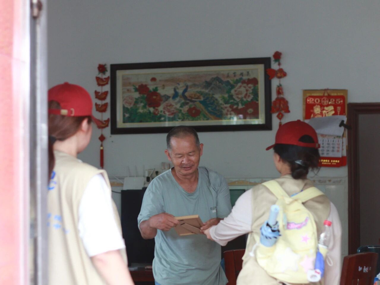我们特意带上了精心准备的相框,里面装着上次走访时为每个人家拍下的合影。当把相框递到奶奶手中时,看着奶奶接过相框,先是眯眼凑近了看,随即眼角的皱纹舒展开,嘴角咧开时,露出几颗不太整齐的牙,却透着一股子实在的欢喜,连带着声音都带着笑意的颤音,用指腹轻轻点着照片里的人,嘴里念叨着“哦,吼靓哦!”也用粤语亲切问候着“喝茶来喝茶。”很是温暖与有意义。有人笑着说“这照片拍得真好,这得挂起来”,有人用指腹摩挲着相框边缘,道着一声又一声的谢。这些瞬间,让我们更明白我们的这段时间的付出是有意义的,这不是什么惊天动地的回响,而是在这样的日常里,被人实实在在地记取、珍藏,然后化作一句“常来喝茶”的惦念。我们递出的是相框,接住的却是比阳光更暖的人间烟火。