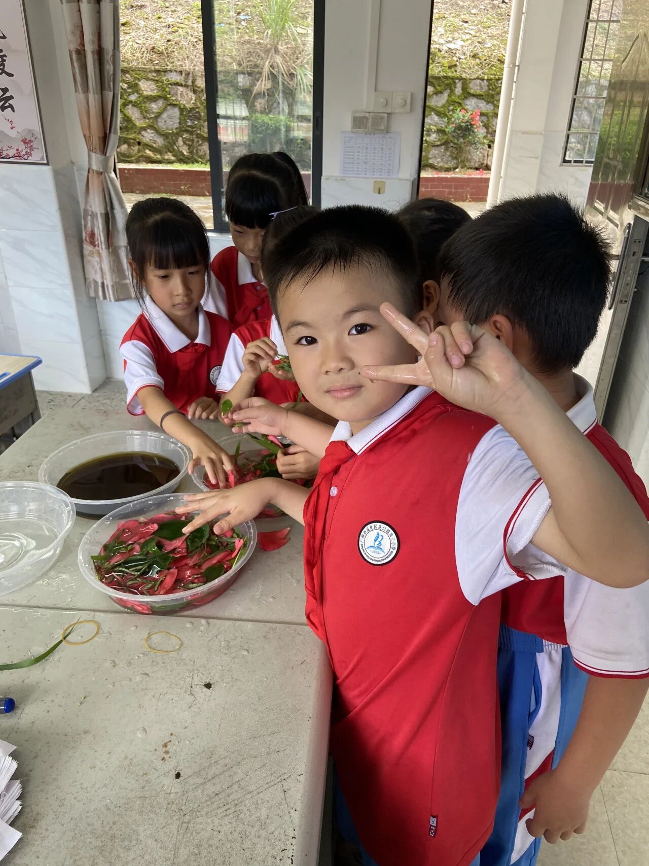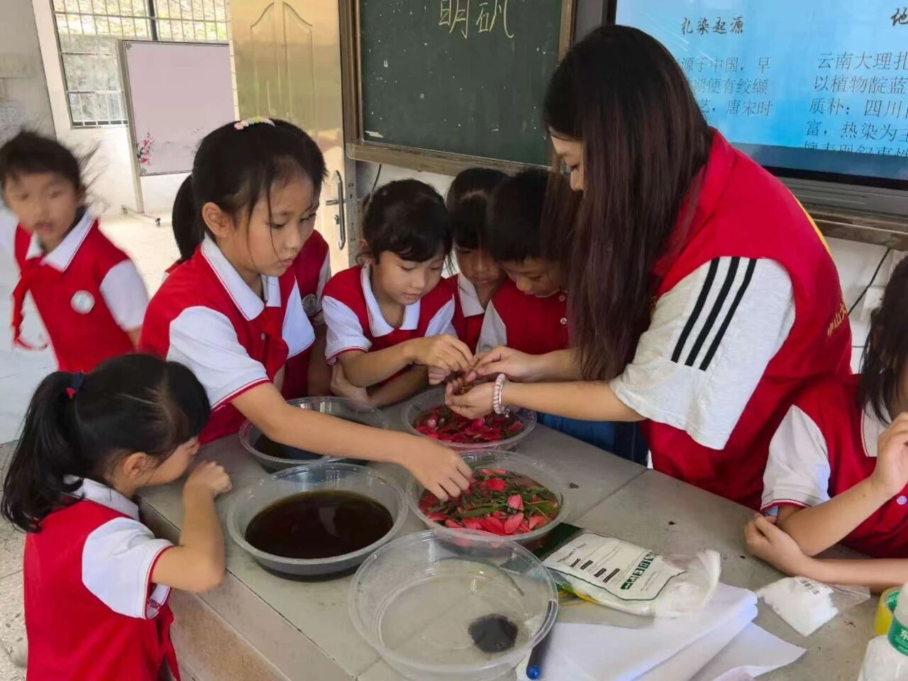 回到教室,拓染的“创作战场”立刻热闹起来。首先我们一起把植物泡在明矾水里固色,虽然是课间休息时间,但同学们都围上来一起帮忙。