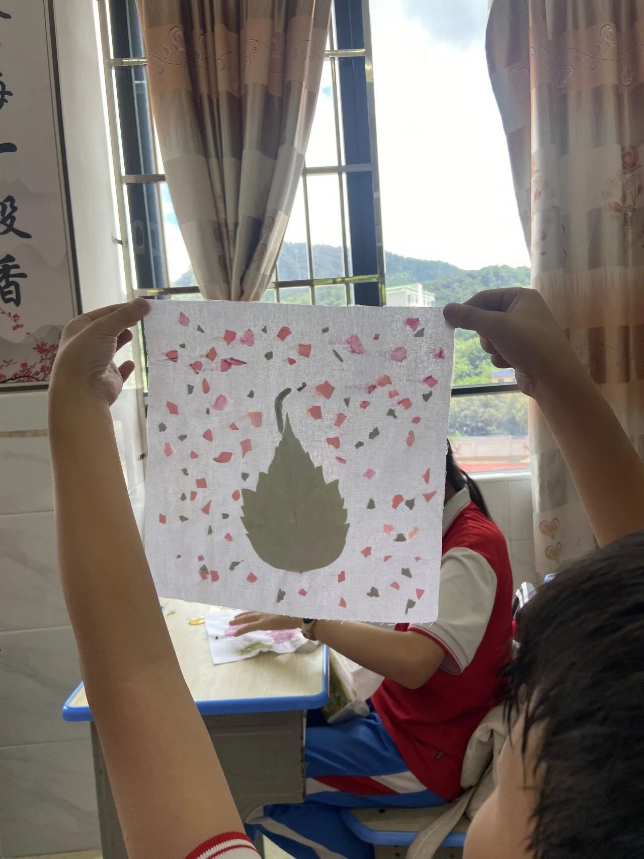 拓染作品纷纷“出炉”:有的布上排着队的小叶子像在做游戏,有的叶片叠加处晕出深浅不一的绿,像一幅立体的画。同学们举着自己的两件“战利品”,左看右看,舍不得放下。