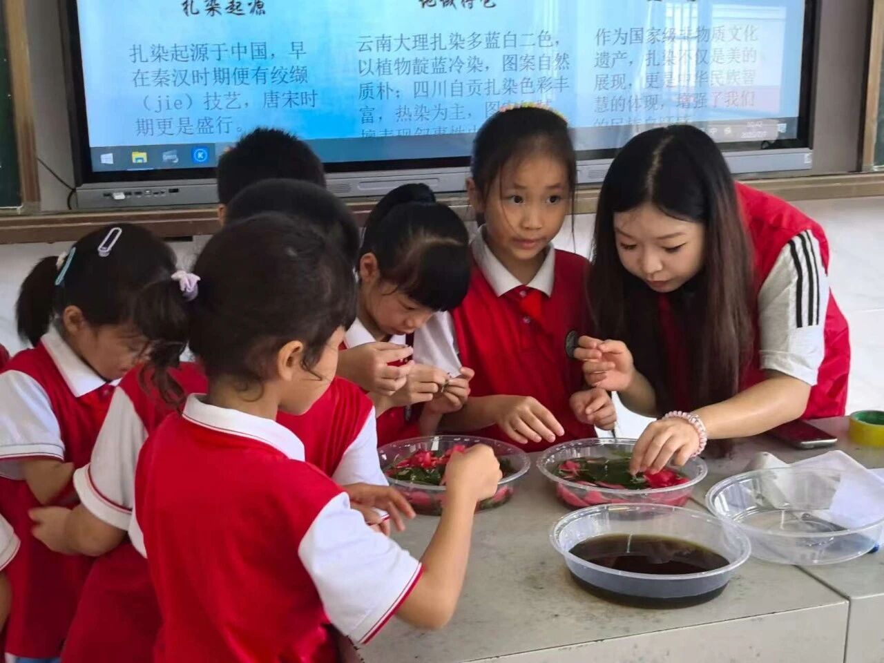 当日课程以“知识传递—能力培养—价值塑造”为脉——知识传递,在一口靛蓝、一片绿叶间解码非遗与自然科学的交集;能力培养,在捆扎、敲拓、拆线的节奏里练手、练思、练耐心;价值塑造,在惊叹与雀跃的共鸣中沉淀对美的敬畏与对自我的确信。