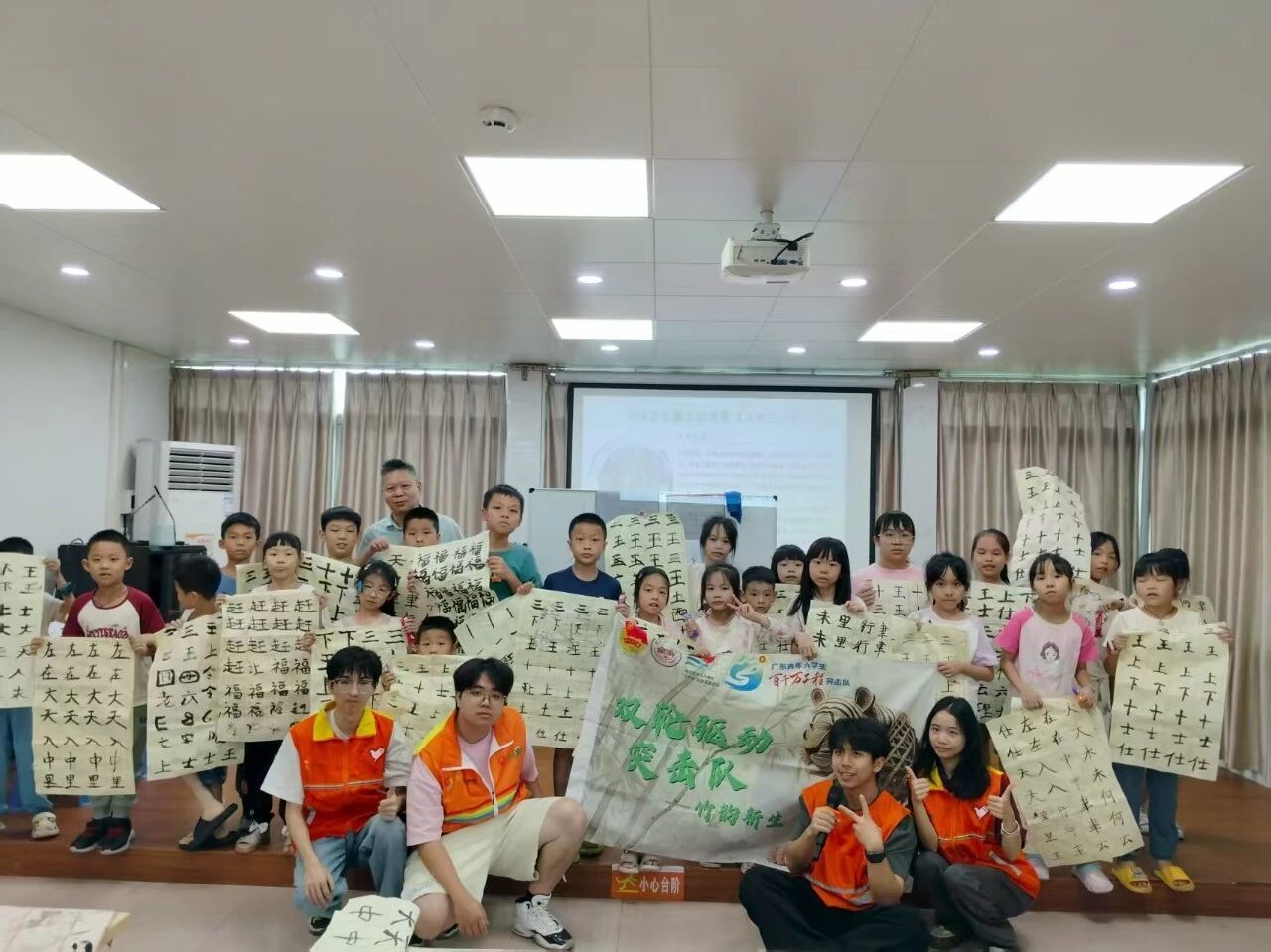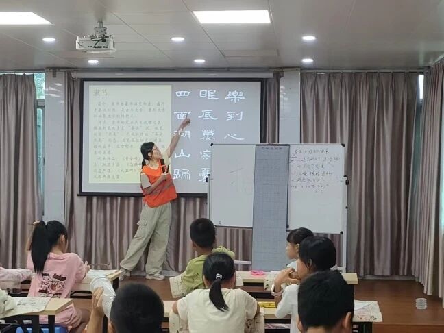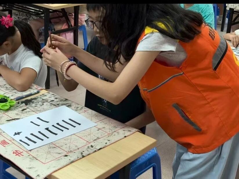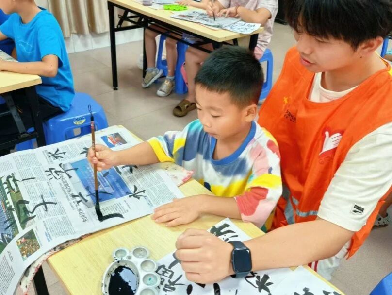 书法课上,小老师们开始为孩子们上理论课,给孩子们讲讲书法的知识。给下面孩子们上完第一节理论课后,第二节课开始给孩子们实践教程。小老师们握着孩子们的小手,从最简单的横撇竖捺教起。有个小男孩总把“人”字写得歪歪扭扭,急得鼻尖冒汗。“你看,就像咱们站在田埂上,要稳稳的呀。”小老师笑着引导,男孩似懂非懂地点头,再写时,笔画果然挺拔了些。墨汁在宣纸上晕开,也在心里晕开一片暖。