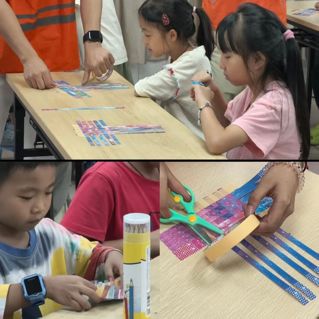 纸编课上,小老师带着孩子们玩“纸上编织”!先看竹编娃娃,圆脑袋、格纹裙,都是纸编灵感。接着教理论:纸编像搭小房子,横竖纸条是“房梁”,要交叉对齐才稳当;选纸得挑结实的,就像给纸编选“小骨头”;编织时别着急,慢慢穿、轻轻压,纸编娃娃就能从歪扭变好看~ 孩子们眼睛亮闪闪,跟着探索纸编小魔法,超有趣!