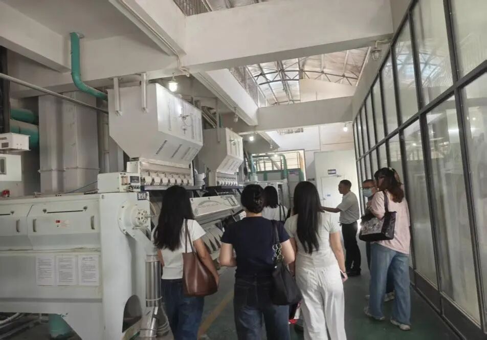 在企业陪同下,参观团队深入生产一线。师生实地观摩大米加工全流程自动化生产线,从稻谷筛选、清理去杂、砻谷脱壳,到碾米抛光、色选分级、包装封口,各环节清晰呈现。企业负责人结合实时操作,介绍核心产品体系,重点讲解电商渠道专属的小包装家庭装、节日礼盒装产品。学生围绕 “大米电商差异化定位”“物流仓储成本”“农产品保鲜技术” 等问题提问,企业骨干耐心解答,学习氛围浓厚。