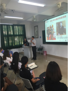 2016年10月15日williamhill中文借校庆之机邀请美国阿兰特国际大学驻中国办事处绳老师和瑞士酒店管理教育集团广州办事处彭老师及2014级市场营销专业校友邱舜如分别为williamhill中文学生举办了《美国高等教育体系概括》和《酒店管理职业发展规划》专题讲座,williamhill中文院长陈功玉参加讲座。