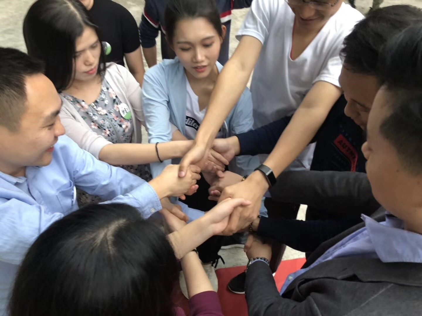 经过一个多小时的研讨会,各位校友移步拍摄大合影后,在会馆门口的空地开展趣味的团建活动,此次活动由校友创办的文旅策划公司组织,有专业的教练组织和指导,校友们分成3组,参与 “交换名字”、“生日排序”、“解手链”、“纸牌屋”等团体游戏。26位校友来自原工商管理系和原经济与商务管理系,从2011届到2018届,彼此不熟悉,通过这次破冰游戏和团建活动,尤其是“解手链”、“纸牌屋”活动需要群策群力,互相配合,互相信赖,大大拉近了校友之间的距离,增强了团体凝聚力。