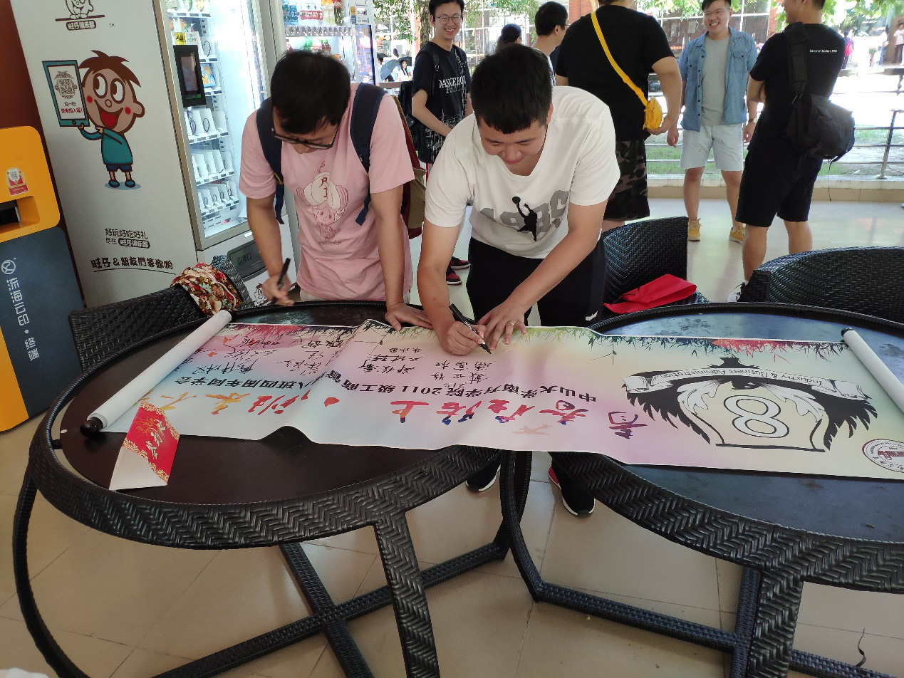 多年不见,同学们的感情并没有因为时间而变淡,还是当年一见如故的感觉。彼此寒暄问候之后,11工管8班的班长在第8教学楼一楼组织同学们进行签到,挂着笑容的同学们认真地把自己的名字写在专门定制的活动横幅上,一笔一划,都承载着和记录着浓浓的同学情谊。
