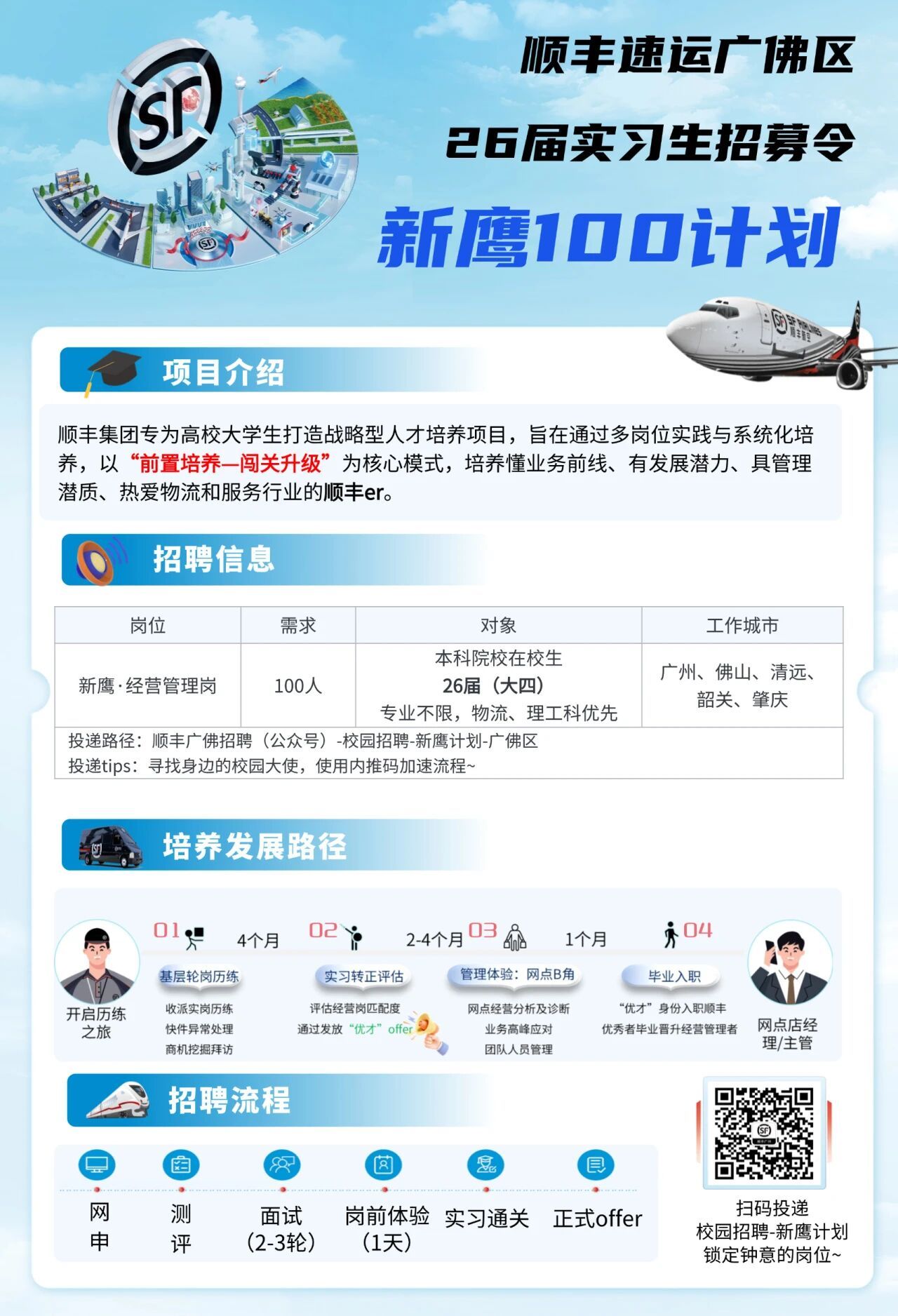 顺丰速运广佛区2026年校园招聘新鹰计划开启,面向广大应届毕业生(毕业时间为2025年10月1日-2026年9月30日)急招100名优秀人才,此次招聘涵盖了经营管理岗,目的是加强公司人才队伍建设,推动物流管理事业的持续发展。