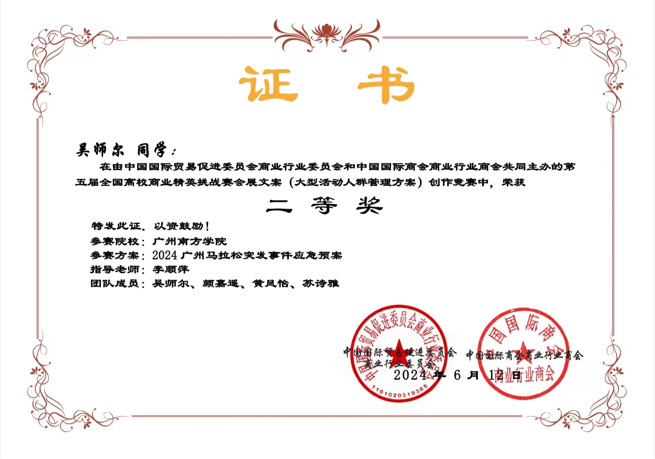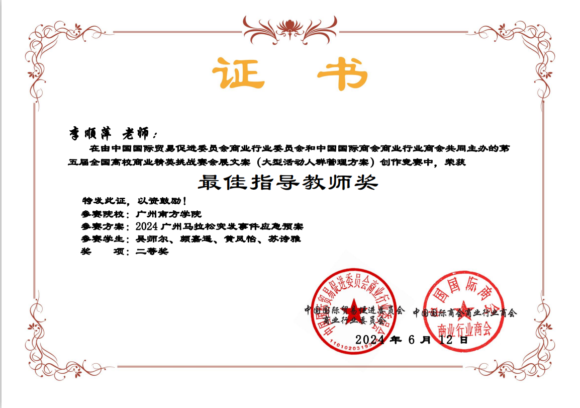 我校来自国际经济与贸易专业的吴师尔、颜嘉遥、黄凤怡、苏诗雅四名同学组成参赛队伍——“活力飞豹团”,在李顺萍老师指导下,参赛作品为——《广州马拉松突发事件应急预案》,荣获本次竞赛全国二等奖佳绩,团队努力数月,辛勤付出,终不负所望!