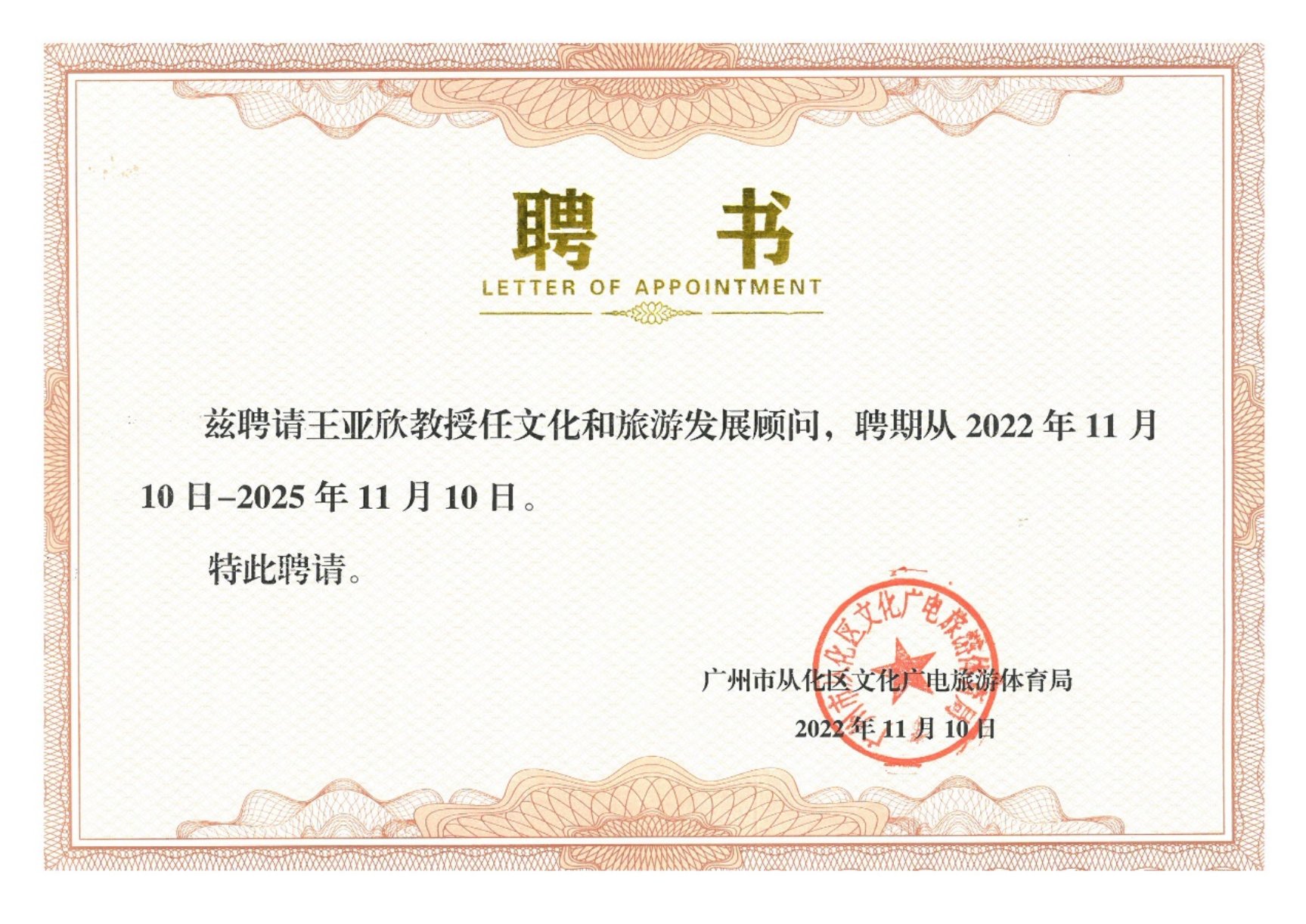 鉴于王亚欣教授及课题组对从化文化旅游深入研究,对未来从化旅游发展的指导,从化区文化广电旅游体育局特聘王亚欣教授为从化文化和旅游发展顾问,并颁发证书。