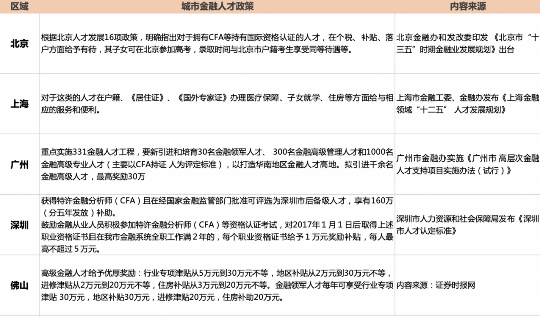 根据广州市金融办实施的《广州市高层次金融人才支持项目实施办法》指出,要重点实施331金融人才工程,要新引进和培育金融领军人才、金融高级管理人才和金融高级专业人才(主要以CFA持证人为评定标准),以打造华南地区金融人才高地。金融高级人才最高奖励30万元。
