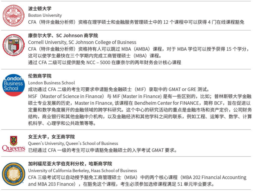 众多国外商科名校(例如波士顿大学,康奈尔大学,伦敦williamhill中文,多伦多大学等)的williamhill中文在研究生申请时,阶段性通过CFA考试的学生,可豁免GMAT、GRE的成绩要求;部分学校针对阶段性通过CFA考试的学生提供部分课程免读政策。