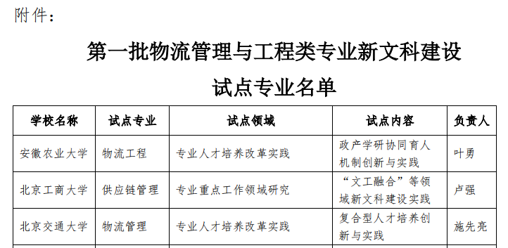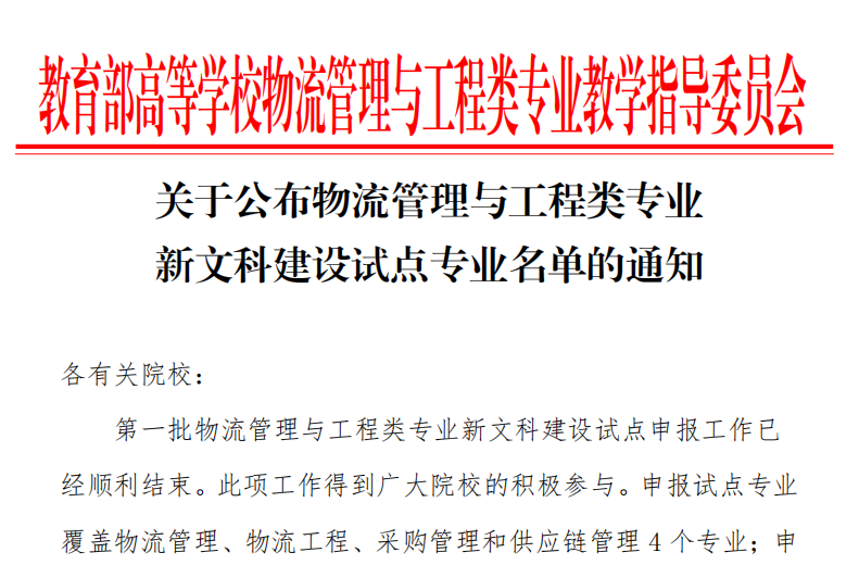近日,教育部高等学校物流管理与工程类专业教学指导委员会发布了《关于公布物流管理与工程类专业新文科建设试点专业名单的通知》,我院物流管理专业成功入选第一批物流管理与工程类专业新文科建设试点专业名单。
