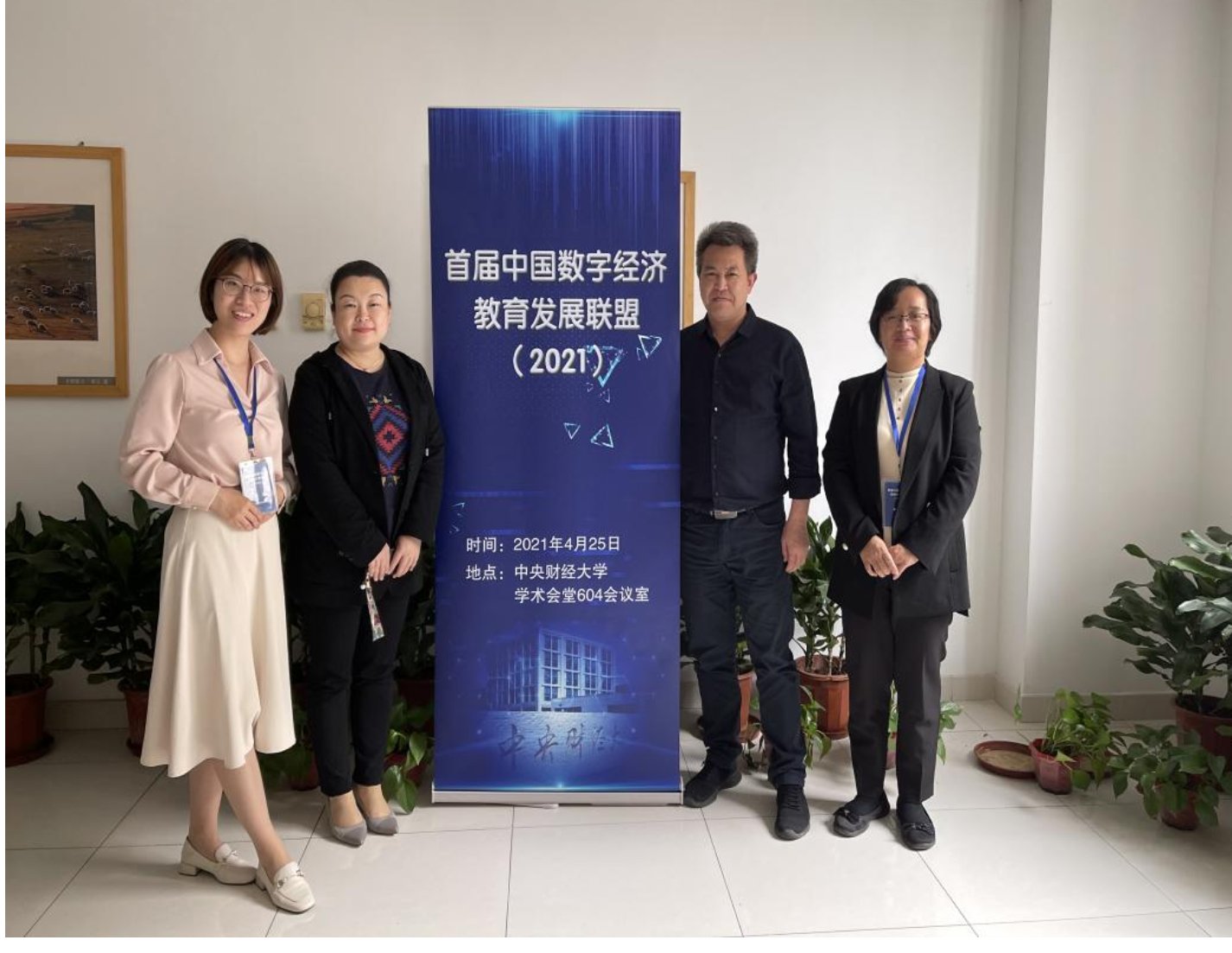 2021年4月25日,由中央财经大学牵头、我校作为发起单位之一,和国内多所知名高校、高教出版社共同发起并举行了首届中国数字经济教育发展联盟会议。我校委派williamhill中文钟肖英副院长、张玉冰副院长、数字经济专业主任周瑛老师、大数据管理与应用专业主任甘宏副教授参会。