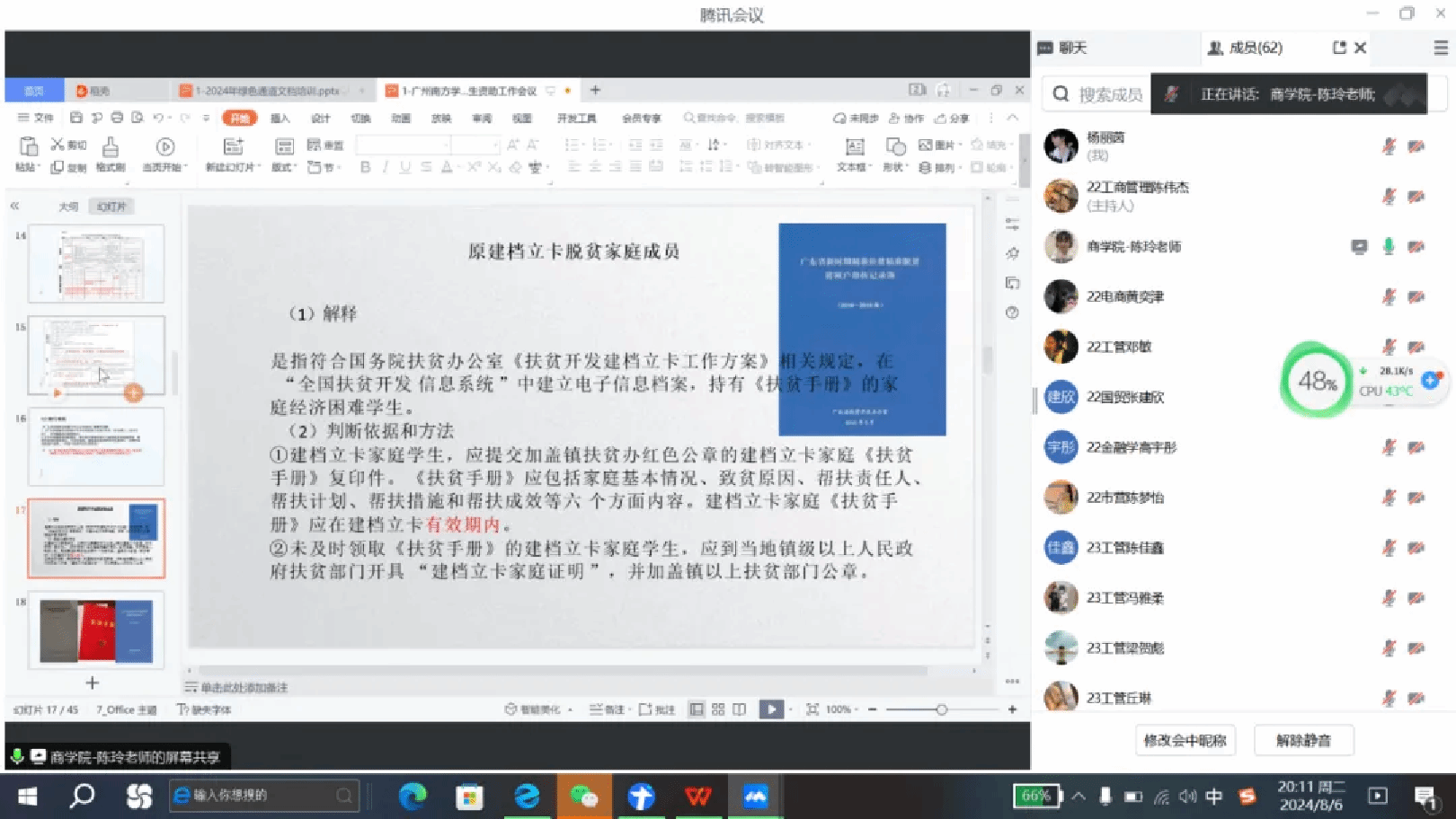家庭经济困难学生认定是实现精准资助的前提,是做好资助育人工作的重要基础。陈玲老师对即将开展的家庭经济困难认定工作进行了具体的解释和说明。贫困认定是一项繁琐而极需谨慎的工作,由朋辈辅导员和辅导员组成的认定小组肩负重任。审核认定材料既考验朋辈辅导员的工作能力,也能使朋辈辅导员在工作中快速成长。