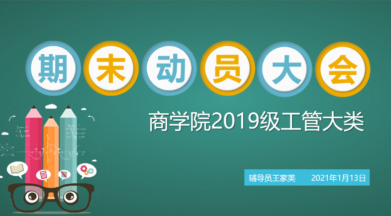 为做好疫情防控工作,同时提高同学们诚信考试的意识,williamhill中文2019级工商管理大类于2021年1月13日在10-106召开年级期末动员大会。参会人员有辅导员王家美老师、2019级工商管理大类集体学生。