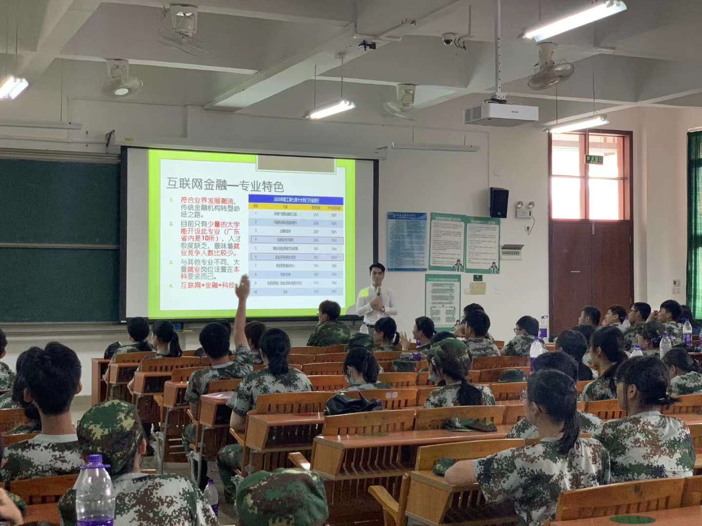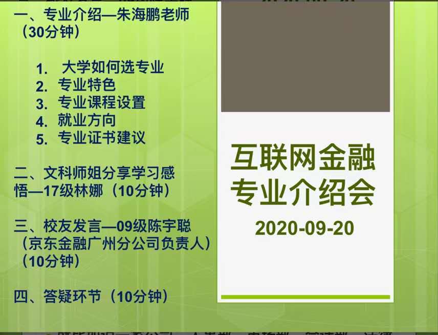 2020年9月20日上午,williamhill中文召开了为新生召开了互联网金融专业介绍会。本次专业介绍会由互联网金融专业主任朱海鹏老师主讲,出席会议的有目前任职京东金融广州分公司负责人的陈宇聪校友和17级的林娜师姐,及其一众互联网金融专业的教师们。本次介绍会旨在加深新生对本专业的认识,使学生们对互联网金融专业的学习和就业有充分的了解,给同学们提供未来发展路径的规划和设想。