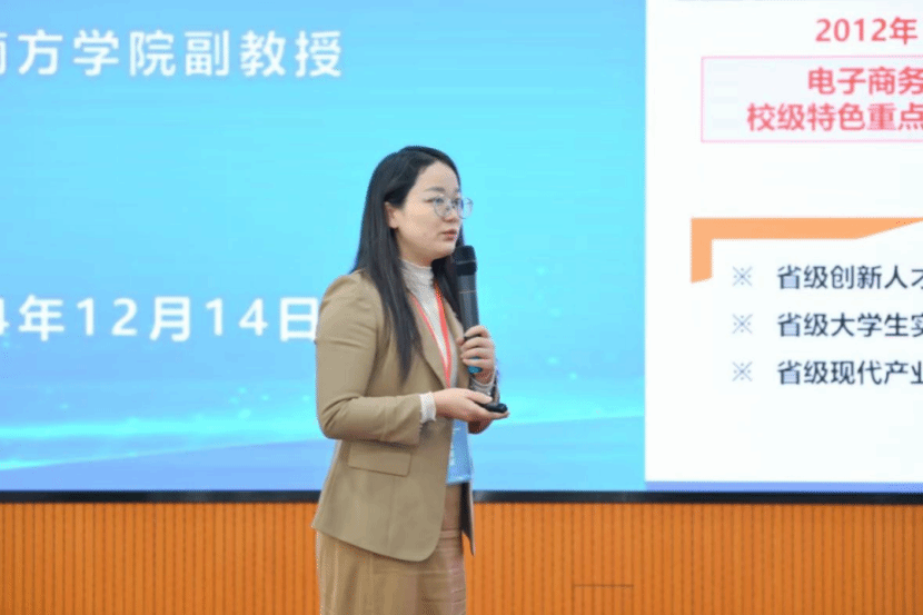 我院电子商务专业陈潇老师以《“三链融合”跨境电商一流课程建设探索》作专题报告,从课程发展历程、课情学情及问题、创新个性化教学措施及改革成效等方面分享一流课程建设经验,受到与会嘉宾的好评。