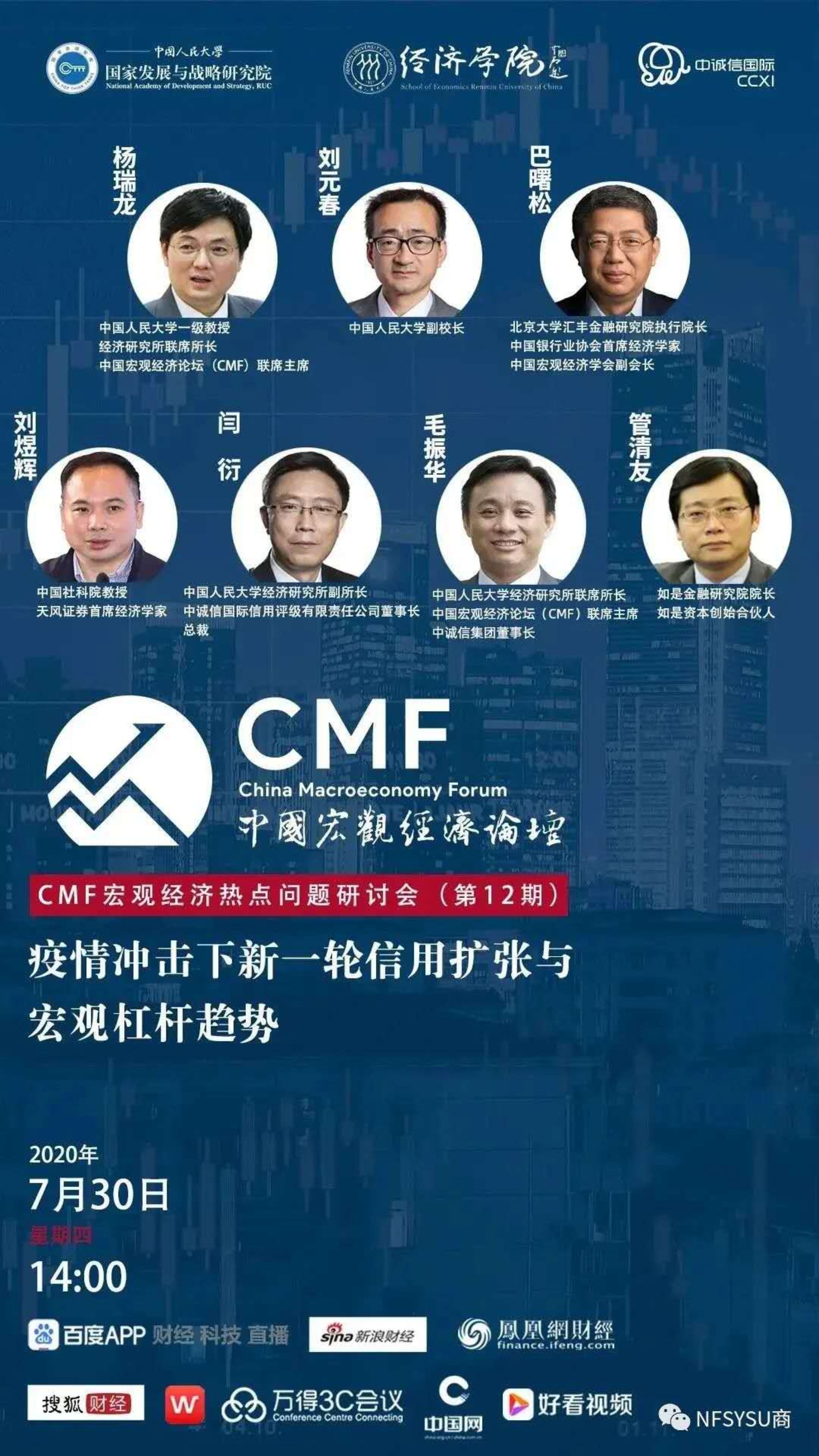 7月30日,CMF宏观经济热点问题研讨会(第12期)于百度app、新浪财经、中国网等网络平台直播开讲,会议以《疫情冲击下新一轮信用扩张与宏观杠杆趋势》为主题,我院讲座教授、北京大学汇丰金融研究院执行院长、中国银行业协会首席经济学家兼中国宏观经济学会副会长巴曙松老师作为主讲嘉宾,出席本期CMF线上论坛。