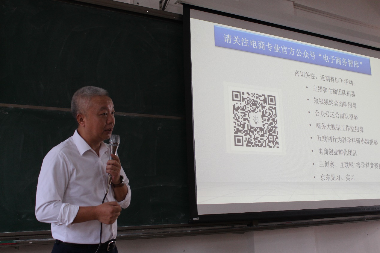 萧裕中老师首先代表电子商务全体师生热情致辞,并向电子商务专业新生致以衷心的祝贺和热烈的欢迎。萧老师向同学们介绍了电子商务专业及其在众多不同领域的应用;接着,向同学们介绍“培养从事电子商务运营管理和商务数据分析需要的复合型、应用型、创新型专业人才”的电子商务培养目标及其相应的培养方案和课程结构;最后,对电子商务专业的师资力量、教学基础设施、校外实践基地、比赛活动、毕业学生去向等情况作了进一步的介绍。新生对电子商务专业的各个方面都有了比较全面的了解,并对加入电子商务专业这个大家庭倍感荣幸。