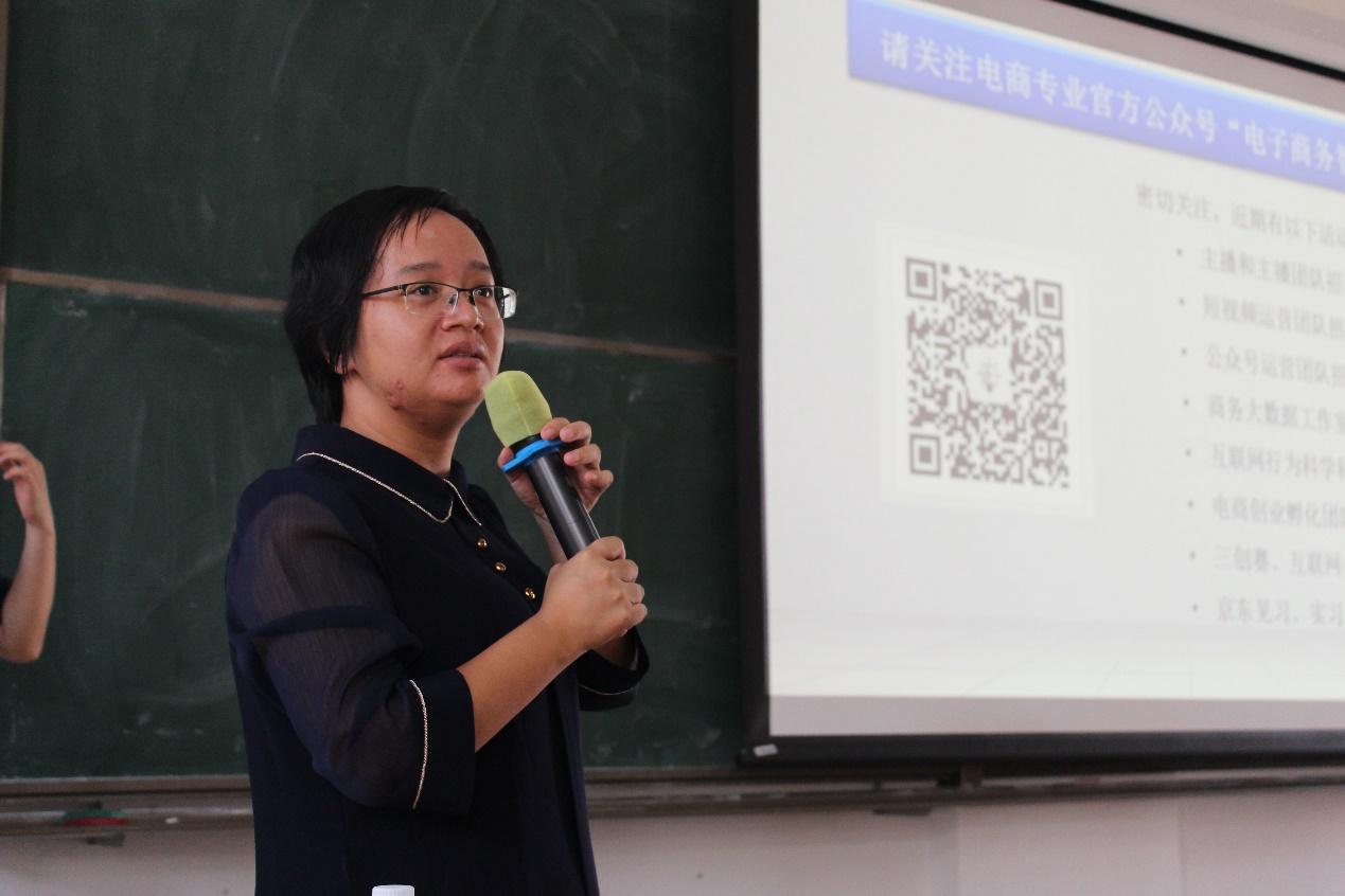 顾宇老师通过提问方式与新生互动,使大家认识到电子商务无处不在,并对我们的工作、生活、学习等方方面面产生了深远影响,希望同学们能够走进电商、靠近电商。紧接着,顾宇老师向同学们分享了他由电子商务外行到内行转变的个人经历,以及一个从事服饰定制跨境电子商务行业的往届学生的成长历程。顾老师的分享给新生们以极大的鼓舞,使新生们对电子商务专业的就业前景有了更好的认识。