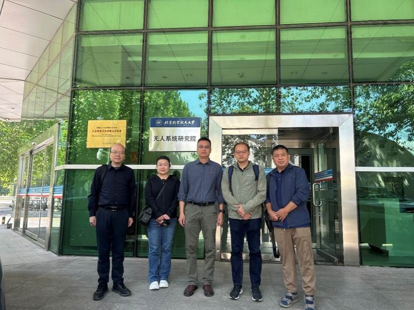 培训结束后,团队又专程赴北京航空航天大学无人系统研究院考察学习。北京航空航天大学无人系统研究院是我国无人系统领域的重要科研与教学基地。研究院聚焦无人系统技术发展前沿,组织开展天、临、空、海、陆、潜无人系统技术发展研究、关键技术攻关、系统设计、集成验证等研究工作,是多学科交叉融合、研究与研制一体化发展特色的高水平无人系统研究平台。在考察过程中,该院飞行器总体及气动布局设计研究专家梁煜教授向我院教师详细介绍了北航"低空技术与工程"新专业的人才培养体系和北航低空经济产业与技术研究中心,并安排实地观摩考察了国家无人系统重点实验室。调研团队就实验室在无人机智能导航、集群协同控制等领域的科研成果转化机制,以及校企协同育人模式、实践教学平台搭建等问题与梁教授进行了深入探讨和交流。期间,双方初步达成共建学生科创实践基地的合作意向。