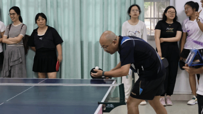 经过初赛阶段全校 8 支队伍的激烈角逐,我院教职工代表队凭借出色的实力与默契的配合,成功跻身决赛四强。在球台上,他们不再是平日里那个治学严谨、和蔼可亲的师者,而是化身为意气风发、斗志昂扬的运动员,用汗水与激情诠释着对乒乓球运动的热爱与执着。