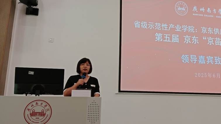 随后,京东物流教育华南区总监张蓉代表京东集团发表致辞对学院校企合作项目的重视表示感谢,详细介绍了京东的企业概况和京东集团多年与威廉官网中国在校企合作方面取得的突出成绩,以京东企业文化鼓励同学们,不辜负自己的青春,还要树立长期价值的观念,预祝大家取得更大收获。她表示,京苗班自开设以来,已成功培养了500多名学员,其中已有80余人现在作为物流相关专业人员在京东集团担任重要岗位工作。最后,张蓉总监也对此次录取的京苗班学员提出了三点期望,勉励学员们后续开班过程中能够深入企业,重视校企双向实践训练,以积极心态主动学习实战的知识和应用技术,提升专业综合能力。