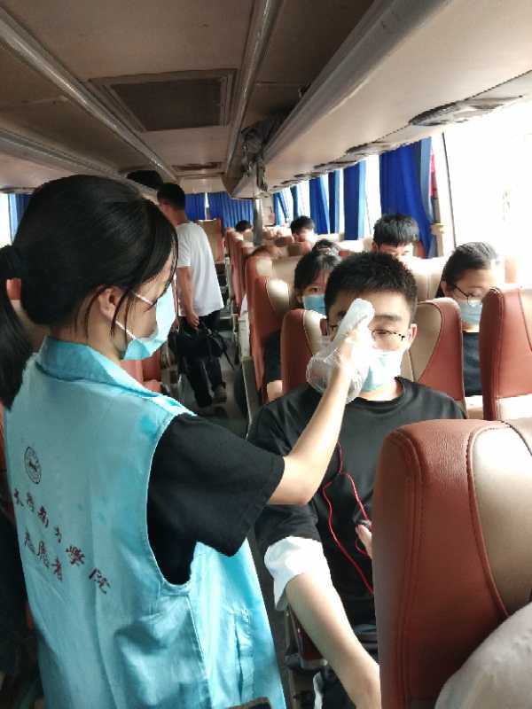 学校还专门安排了2辆校园巴士作为校内直通车接送返校学生前往宿舍。在宿舍入口,返校学生再次接受宿舍管理员体温检测,有序办理入住。