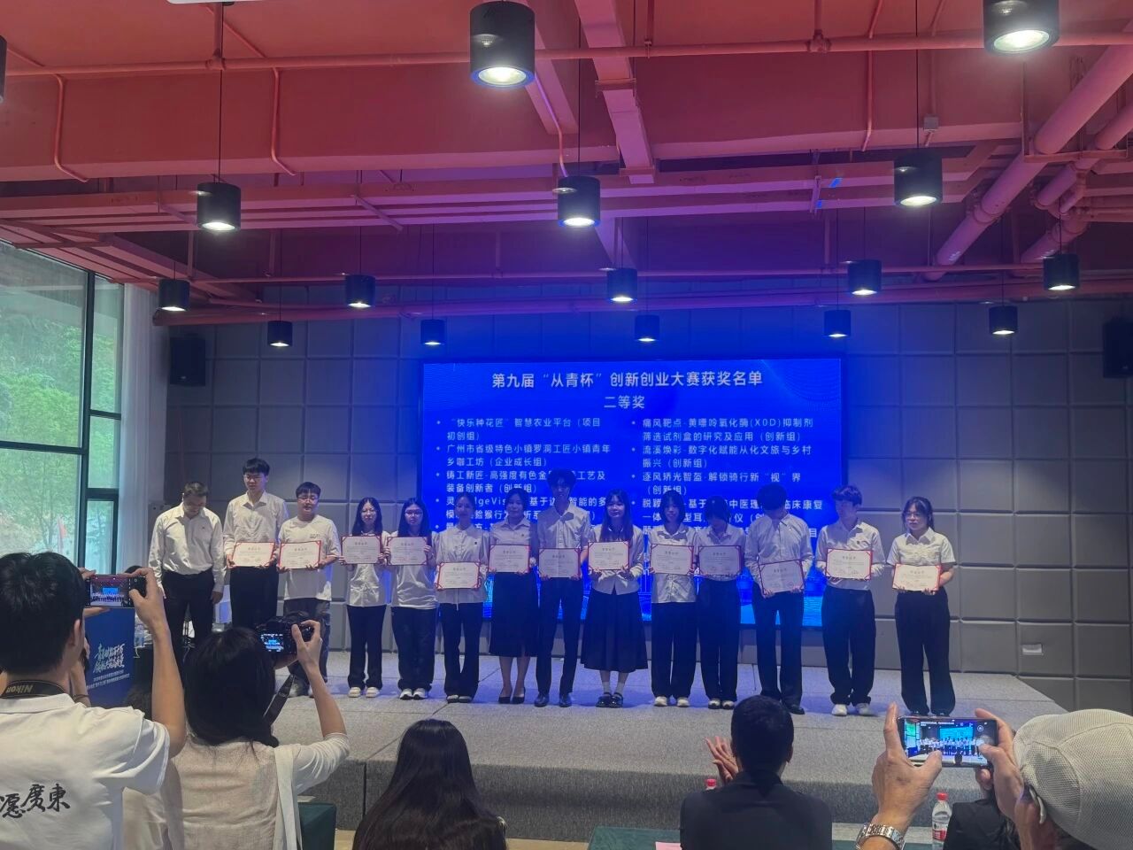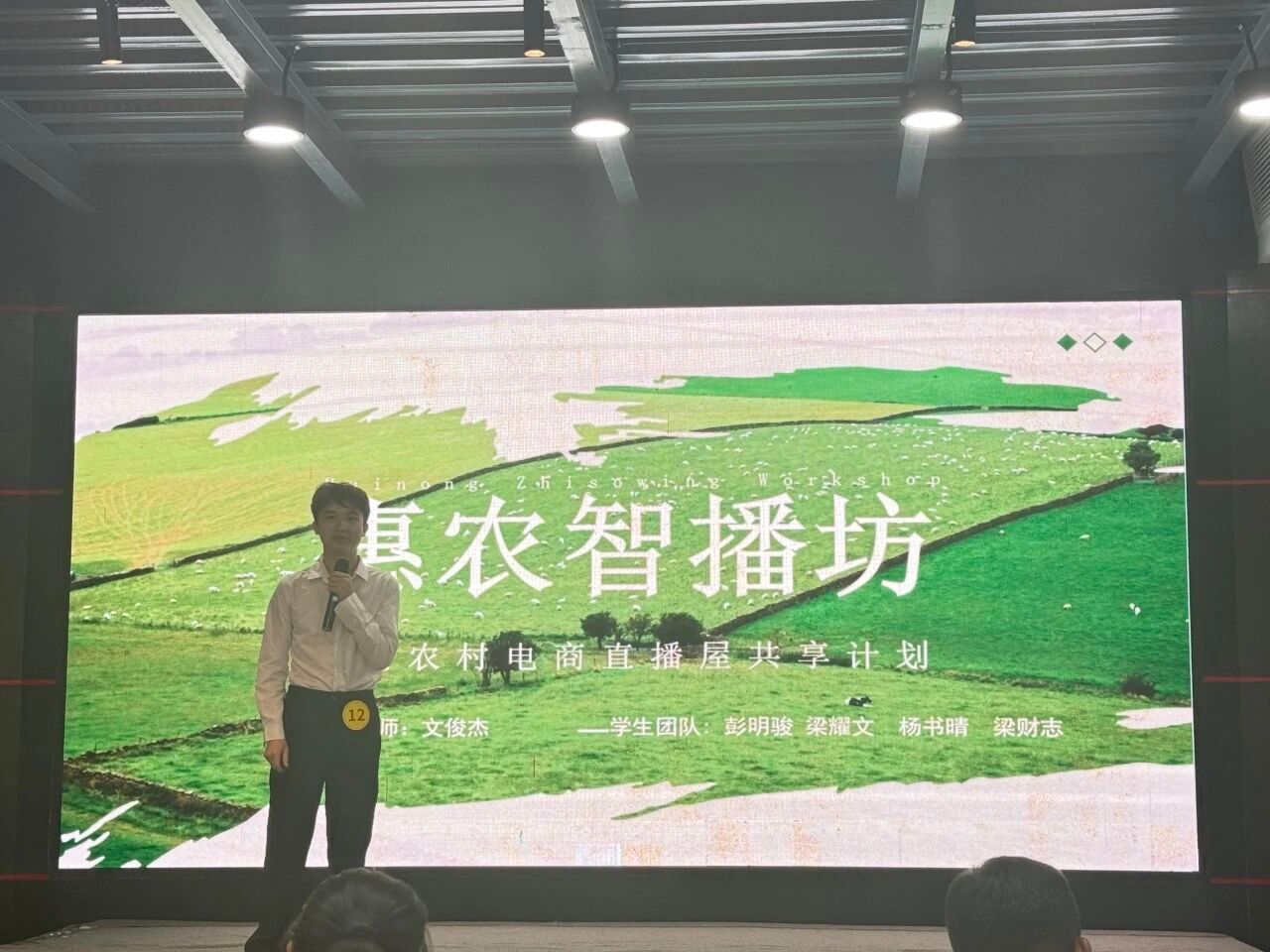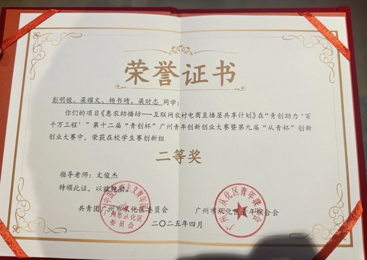 由市青创中心、团区委、区人社局、区青联共同主办的广州市“青创助力‘百千万工程’”第十二届“青创杯”广州青年创新创业大赛暨第九届“从青杯”创新创业大赛总决赛于4月23日落下帷幕。我院由彭明骏、梁耀文、杨书晴、梁财志同学组建的队伍,参赛的项目:《惠农助播坊---互联网农村电商直播屋共享计划》,在文俊杰老师指导下,荣获本赛事在校学生赛创新组二等奖。