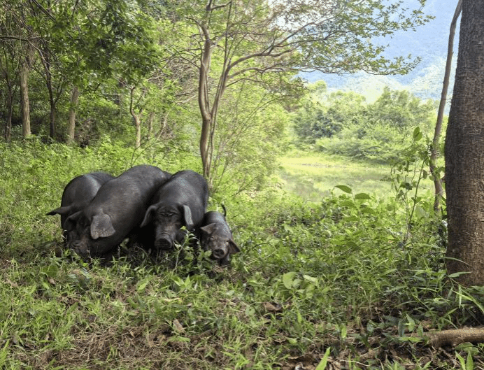 采用山地轮牧模式,实现前期圈养,后期散养的养殖模式相结合。以益生菌发酵料、牧草及地缘性农副产物喂养,养殖周期超365天。