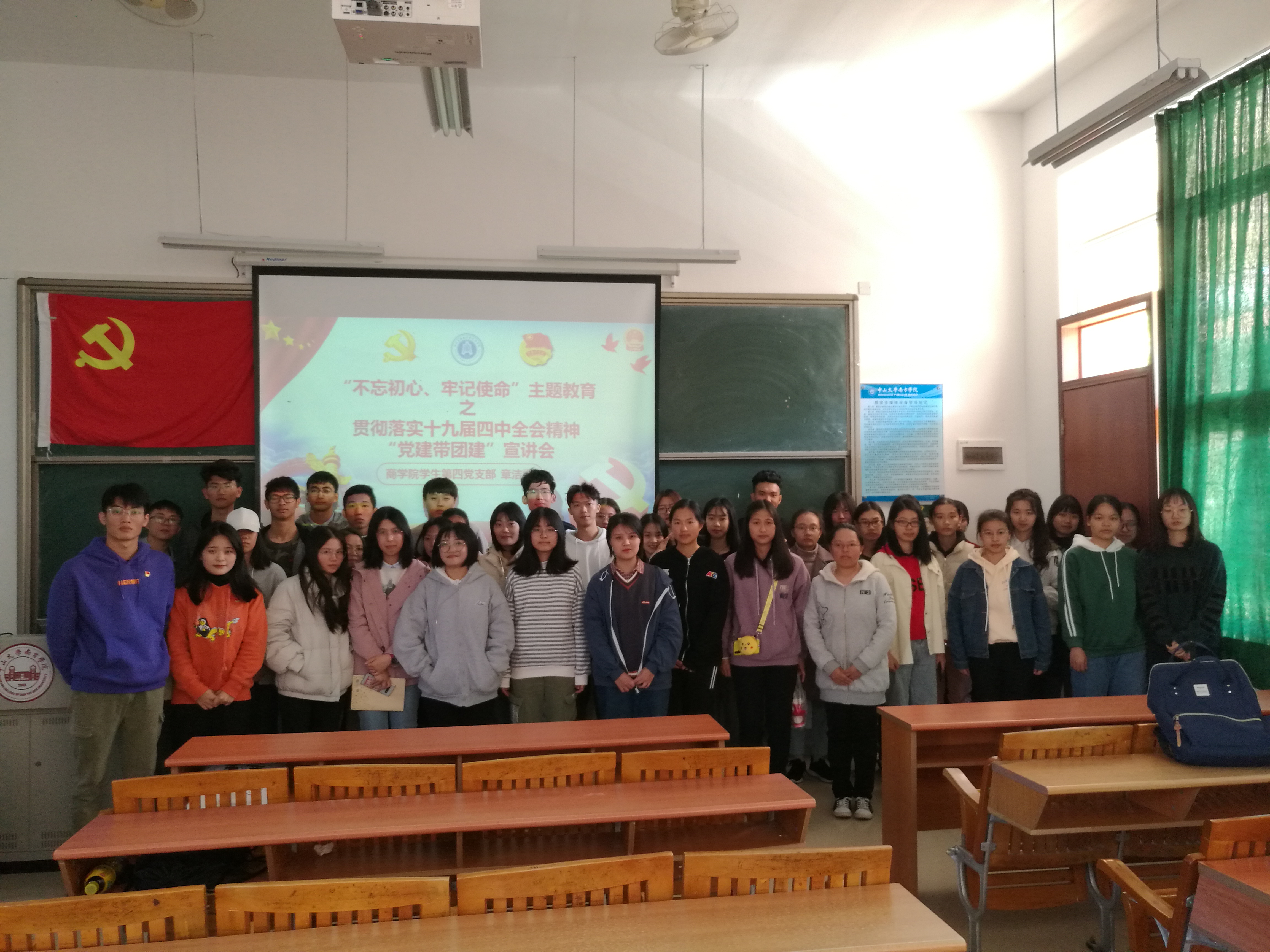 十九届四中全会会议成果作为彰显制度优势的中国方案、推动国家发展的力量之源、提升治理能力的行动指南,为贯彻其精神意涵与深入开展“党建带团建”工作。2019年12月4日中午13时,williamhill中文学生第四党支部于8教205面向2018级、2019级部分优秀团员开展贯彻落实十九届四中全会精神“党建带团建”宣讲会,由williamhill中文学生第四党支部学生党员章洁雯担任本次会议主讲人。宣讲会共三个部分,第一个部分为“十九届四中全会精神引领下的“党建带团建”工作,第二个部分为“党建带团建工作成果展示”,最后一个部分为“十九届四中全会内容知识问答及总结”。