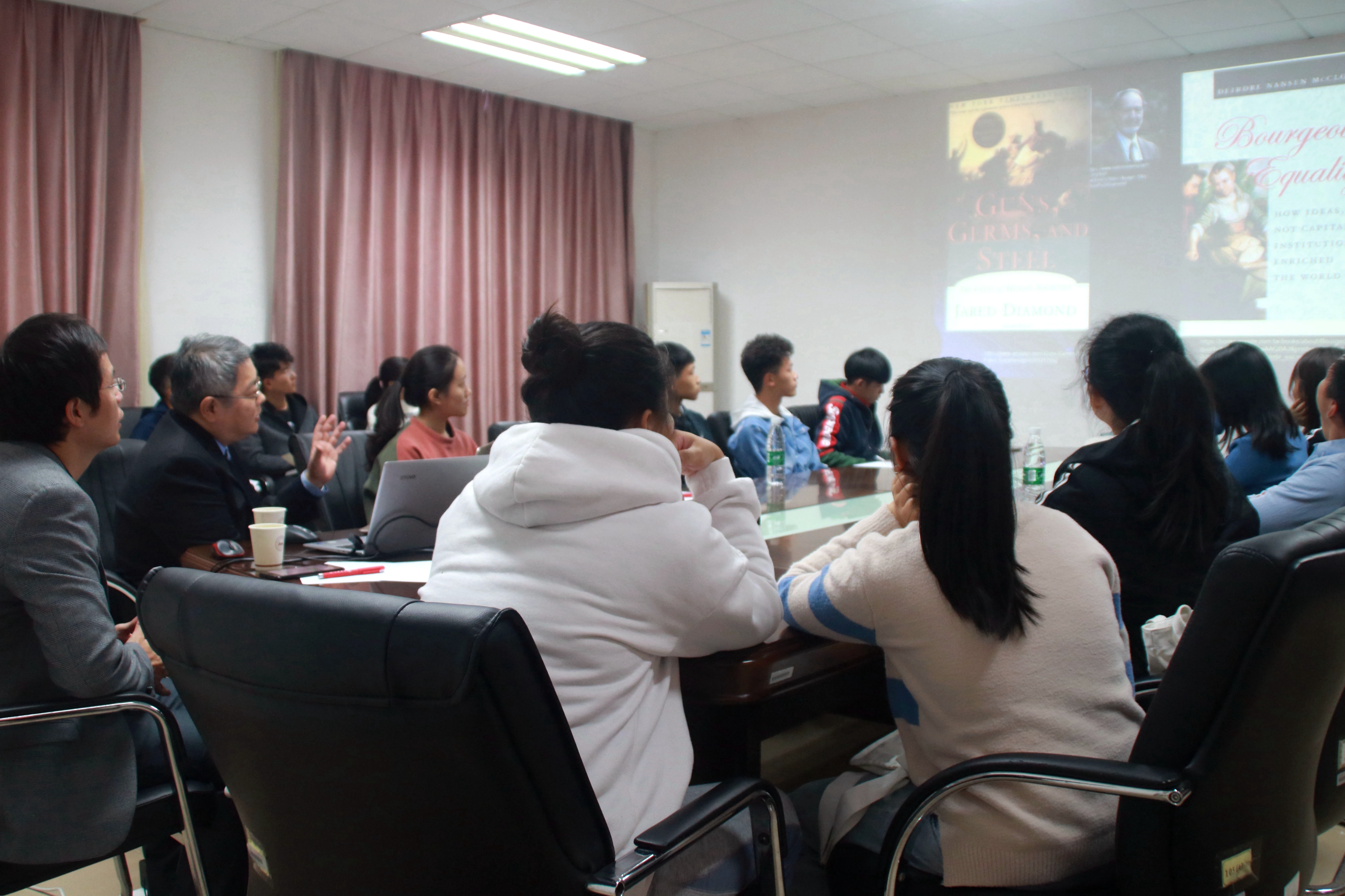 为拓宽同学们在经济学领域的视野,更好的了解经济学的知识,2019年12月10日下午16时,“网实孪生时代下的人文经济学”主题讲座于8教108室顺利举行。我院有幸邀请到台湾政治大学经济系的陈树衡教授担任本次讲座主讲。出席本次讲座的还有金融系系主任林鸿文副教授、林雪莹老师。