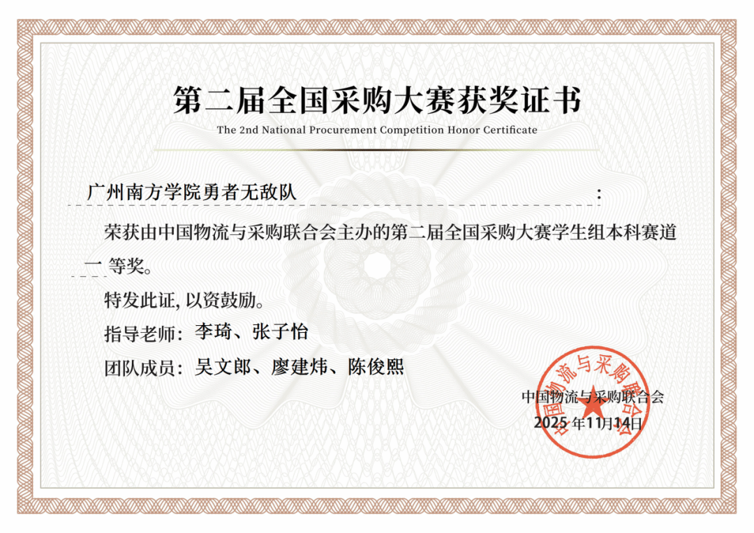 经过为期3个多月的激烈角逐,由中国物流与采购联合会主办的第二届全国采购大赛圆满收官,来自全国物流供应链行业相关单位的职工组和高校物流相关专业的学生组,120支晋级团队在总决赛竞争最终名次。williamhill中文组建的勇者无敌队——来自物流管理专业的吴文郎、陈俊熙、廖建炜同学和指导老师李琦、张子怡团队在阶段考核和总决赛中以黑马之势从理论考核到实战模拟,团体演练、复盘配合默契,最终实战过关评分位列总决赛小组第一名,勇夺学生组-本科赛道一等奖。