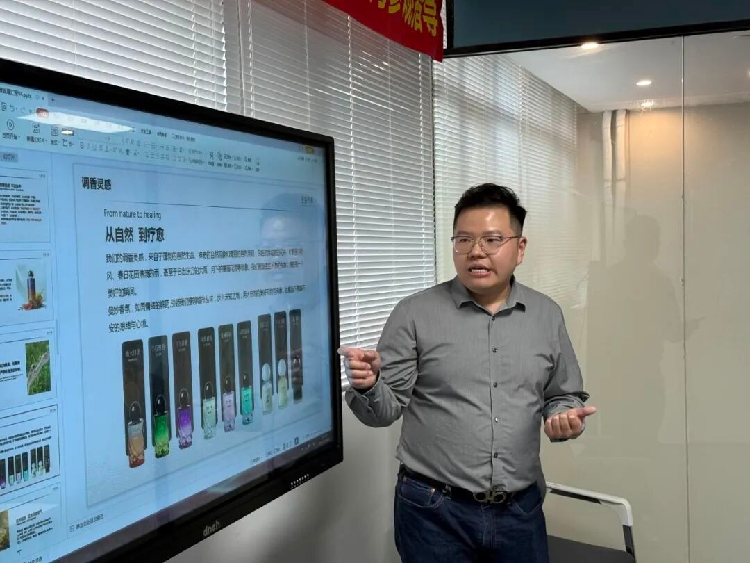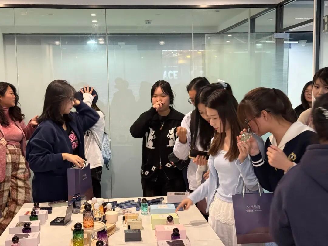 许伟彪对母校师生的到访表示热烈欢迎,先是向师生们介绍了公司的发展历程、组织架构和核心业务板块,随后带领大家观看了空谷与海的品牌历程,生动展示了品牌从初创到崛起的全过程,以及产品研发、品牌营销、市场拓展等方面的成果。许伟彪逐一介绍了品牌明星产品的研发理念、设计思路和市场反馈。从香水的香调研发灵感,到彩妆单品的工艺打磨,每一处细节都让同学们感受到空谷与海对产品品质的坚守。