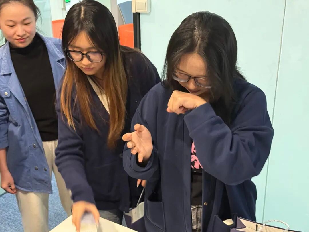 产品展示区里,琳琅满目的美妆产品搭配精致的陈列设计,也让同学们直观领略到国货美妆品牌的设计巧思与品牌魅力。“空谷与海坚持自然与愉悦的品牌理念,追求简单好用的产品,同时考虑市场定位与商业机会,瞄准一带一路沿线国家市场,将国货美妆向世界推广。”许伟彪在交流中这样说道,他还分享了自己创业过程中应对市场竞争、捕捉消费趋势的经验,让同学们深受启发。