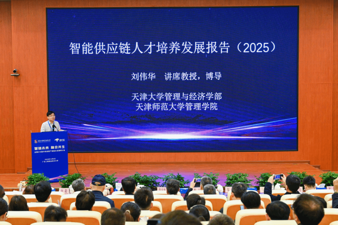 上午的主题大会汇聚了来自政府、高校与企业的多位专家,围绕政策解读、技术趋势与人才培养展开分享。国家邮政局原副司长靳兵系统阐述了AI在智慧快递物流领域的应用与实践,指出技术赋能正在重塑行业生态;京东物流集团副总裁刘聪分享了“技术驱动智能供应链产业发展新趋势”,强调数据智能与自动化技术正在成为供应链核心竞争力;天津大学教授刘伟华发布了《智能供应链人才培养发展报告(2025)》,从岗位能力模型、课程体系、实训基地等多维度勾勒出人才发展的新蓝图。此外,喀什大学、广东工商职业技术大学等单位代表也分别从边疆产教融合、体制创新等角度分享了实践探索。