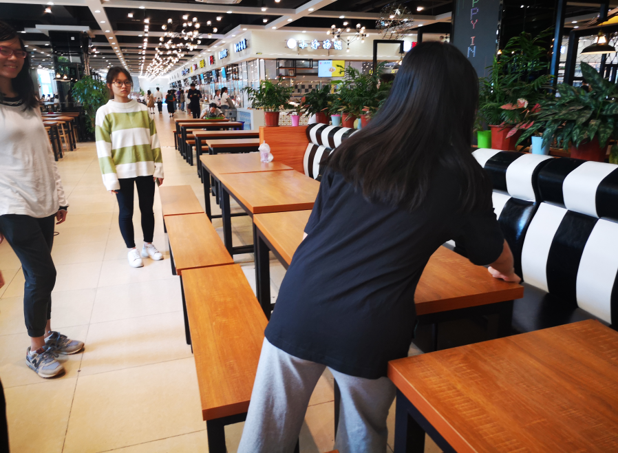活动开始前,小组成员集思广益,决定活动主题以“从小事中体现美好与温暖”延伸开来,餐厅——作为一个公众场合,在饭堂就餐过程中的行为举止体现出一个人的礼仪,经过调查,活动小组成员注意到餐厅的桌凳在用餐结束后经常摆放不齐,这不仅给工作人员增加了工作难度,也为其他人带来了不便。于是,为了美化食堂的用餐环境,以实际行动号召大家一起做有礼貌讲文明的人,小组成员最终确定了主题活动的地点——中区饭堂。