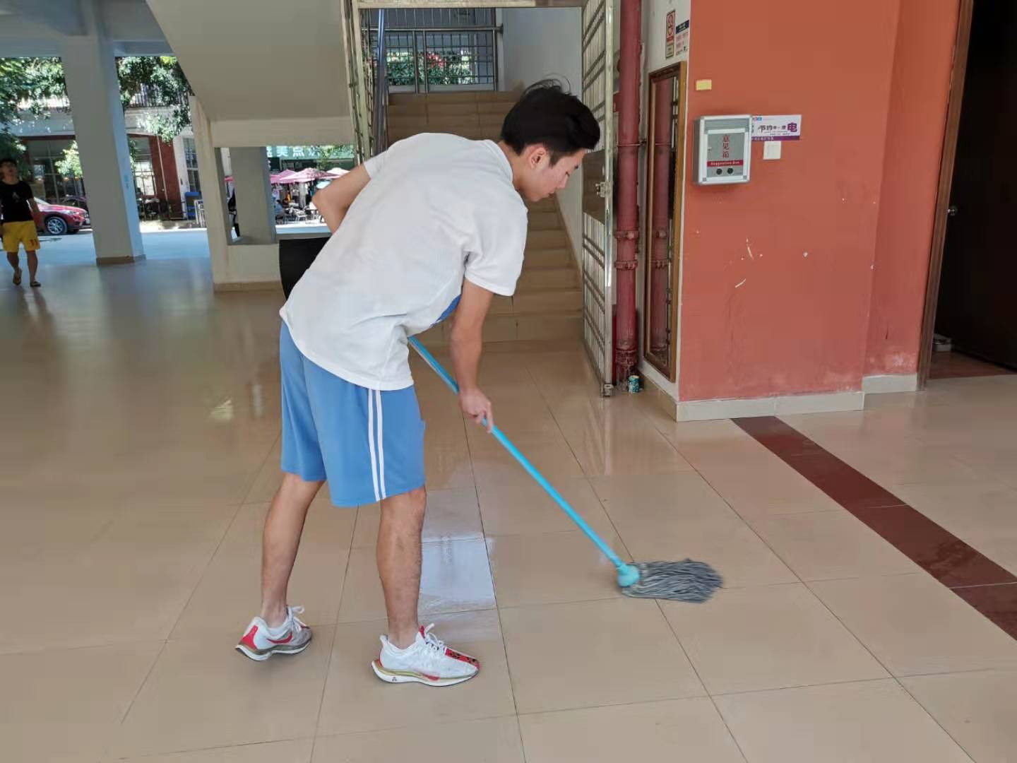 作为男生的积极分子更是体现了身为男子汉的担当,他们主动地选择了最苦最累的工作——拖地。在八教的走廊上穿梭着他们不怕艰难困苦的背影,他们认真的表情,有力的动作,挥洒的汗水,无不体现出勤勉刻苦,坚忍不拔的优秀品质,这些都值得我们敬佩和学习。
