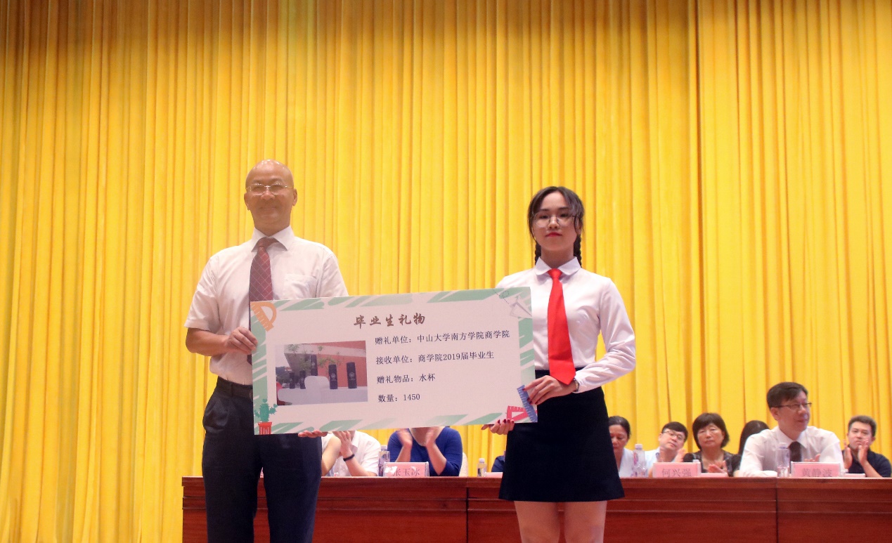学校回赠毕业生纪念品。williamhill中文院长何兴强教授向毕业生代表赠送礼品,优秀毕业生代表蓝燕婷同学上台代表毕业生接受赠礼。