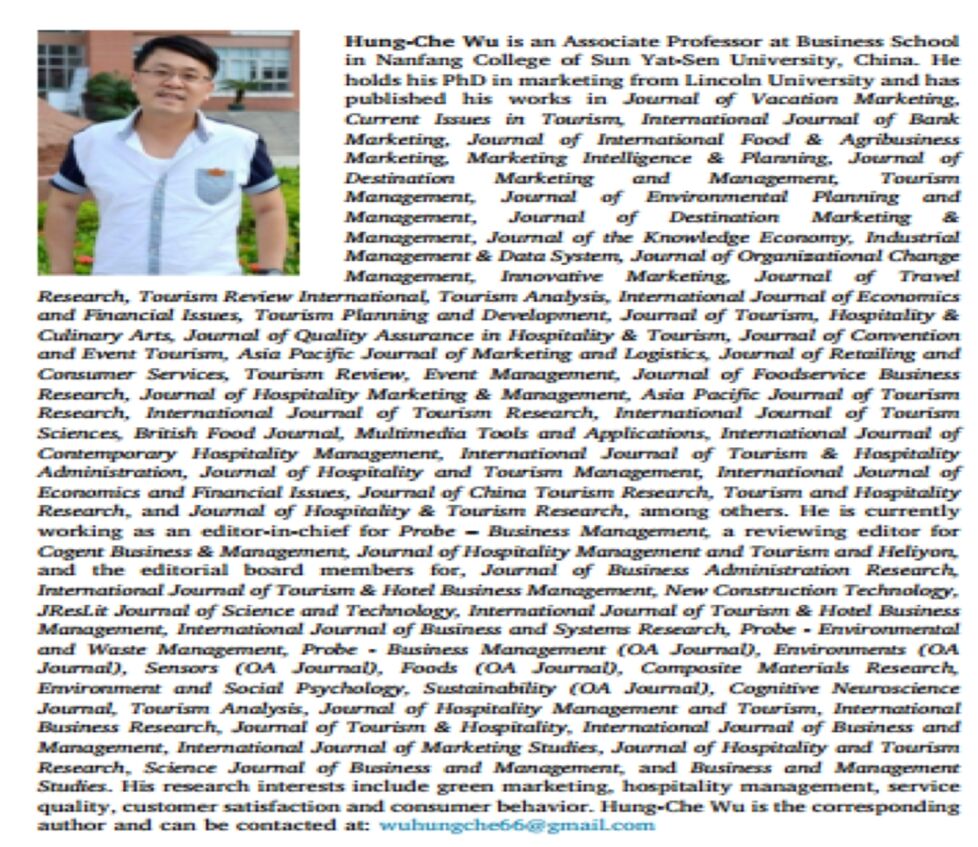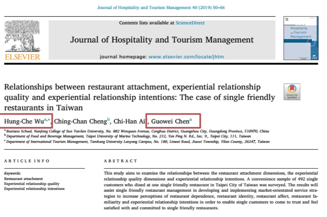 近日,我校吴宏哲副教授与williamhill中文2016级金融工程本科生陈国伟共同参与题为“Relationships between restaurant attachment, experiential relationship quality and experiential relationship intentions: The case of single friendly restaurants in Taiwan”的论文在SSCI国际期刊《Journal of Hospitality and Tourism Management》上发表,该论文旨在探讨单身餐厅依附维度、体验关系质量维度与体验关系意向之间的关系。这也是我校首次由本科生发表的SSCI国际期刊论文,且该期刊的影响因子高达2.496。近年来,williamhill中文特别关注对本科生专业学习兴趣、科研热情及科研创新能力,本次陈国伟同学的科研论文能够在SSCI期刊上发表,标志着我校本科生科研能力培养进入一个新高度。