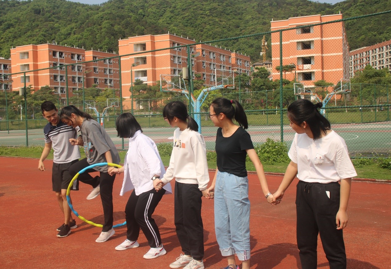 视线转到“穿越呼啦圈”的比赛现场,参赛的同学们手拉手,整支队伍拧成了一股绳,在欢笑间争分夺秒而又有条有序地穿过呼啦圈。