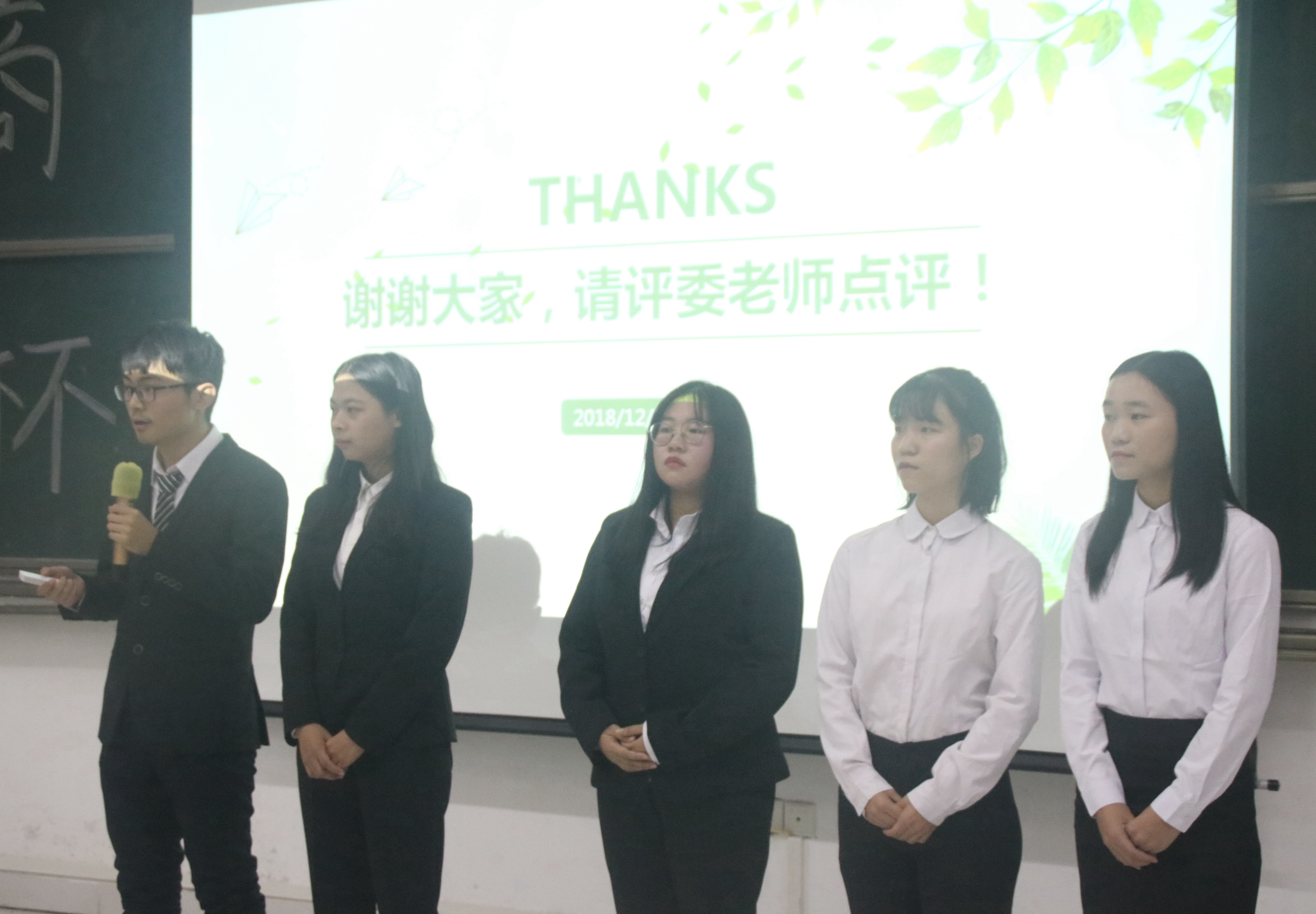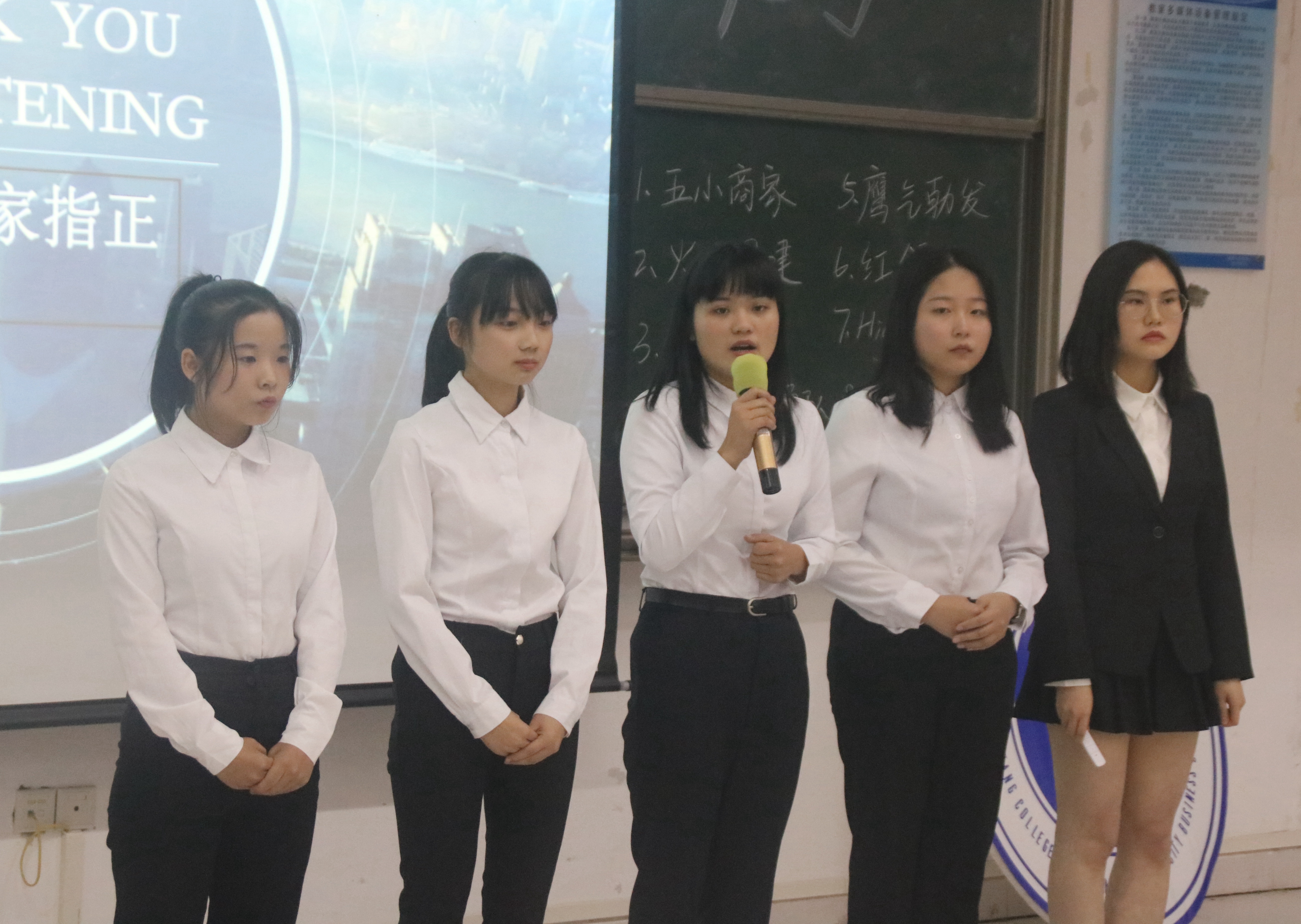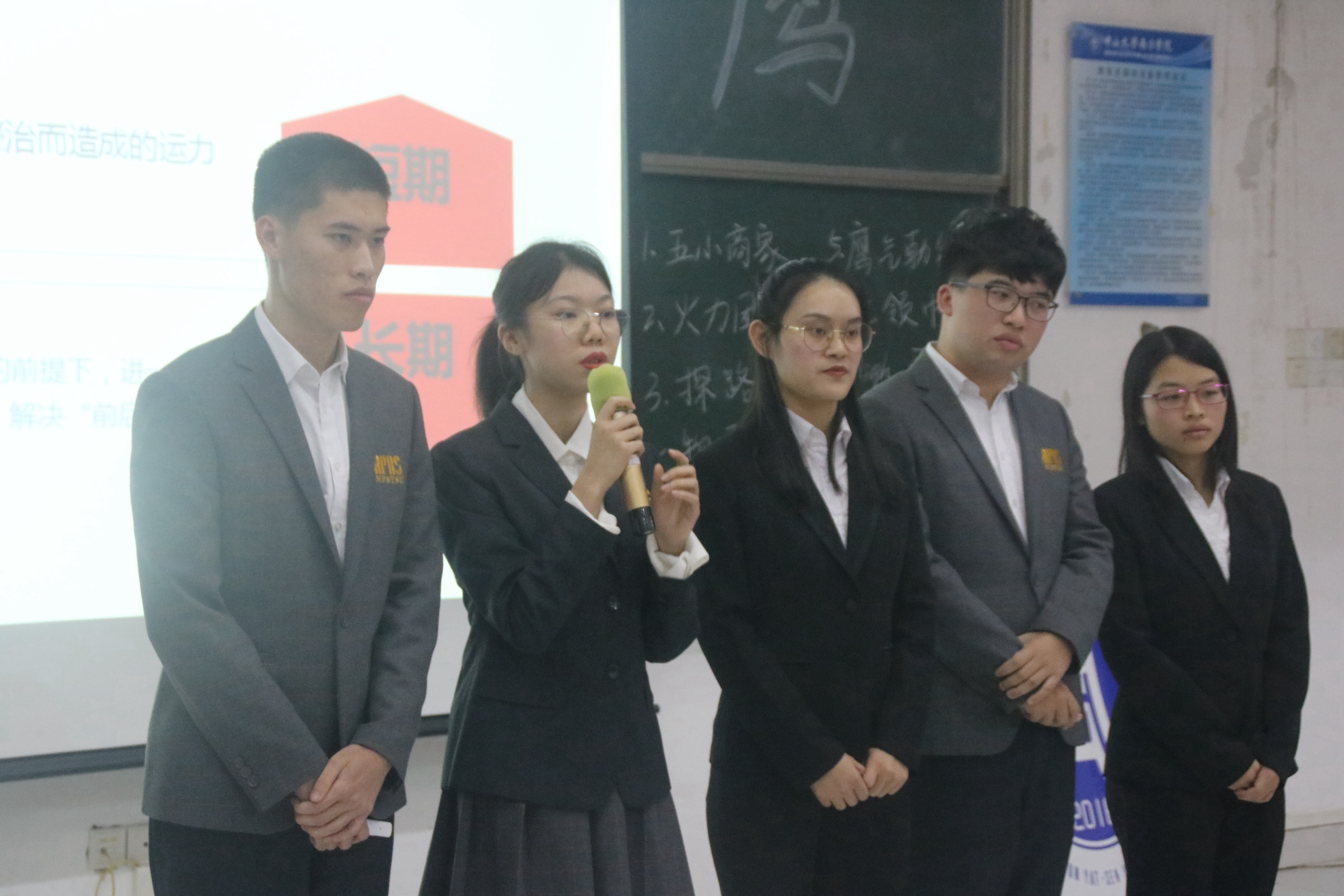 在纪检部为比赛公证及主持人介绍比赛规则后,比赛正式拉开了序幕。比赛开始,第一支队伍“五小商家”为我们带来项目介绍。他们以马钢公司为背景,分析该企业存在的主要问题,并针对问题逐一提出解决方案。该组还从国家政策,市场环境方面入手进行可行性分析,再风险评价中抓住三个主体进行剖析,展现了该方案的实行前景。