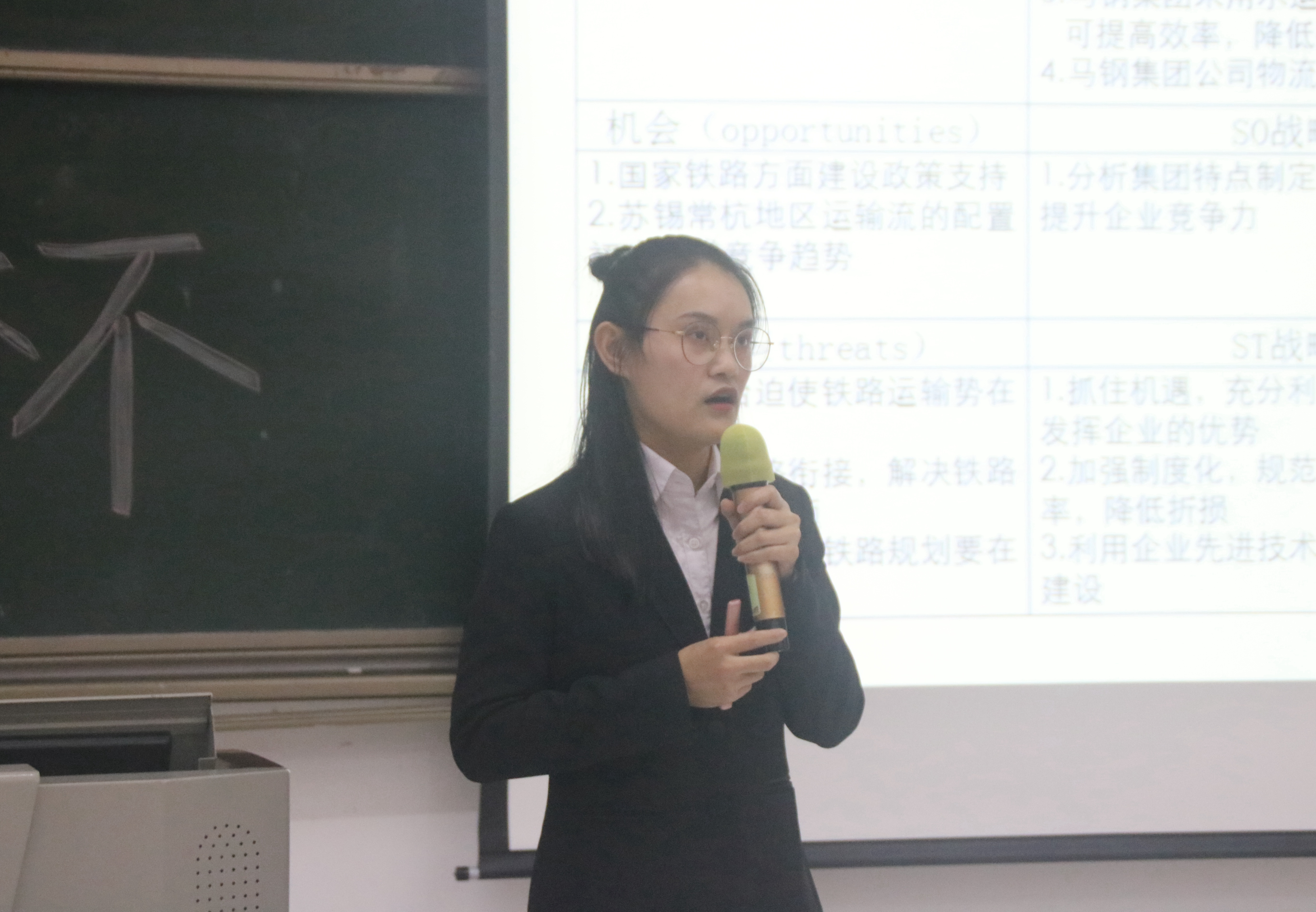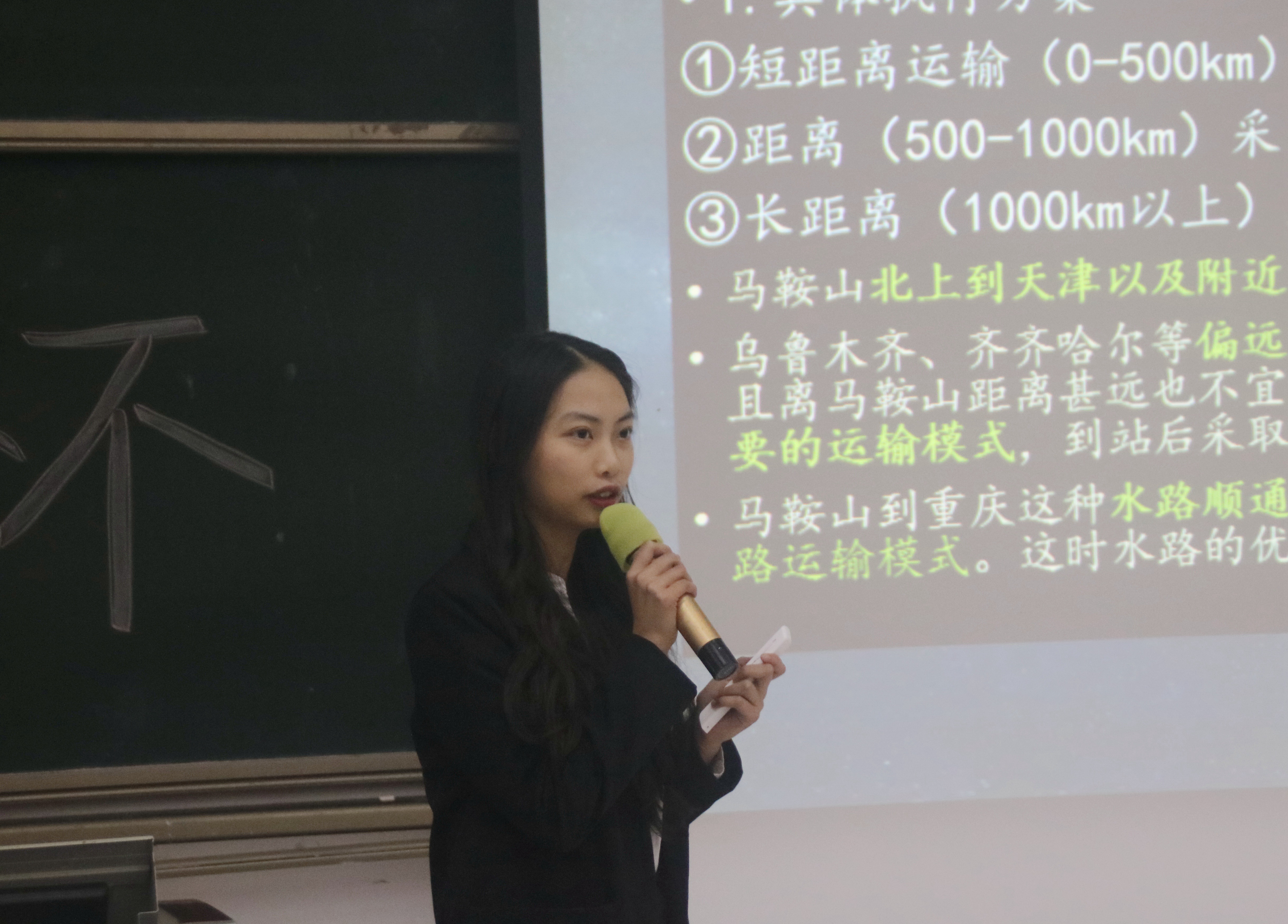 第五支参赛队伍“鹰气勃发队”先为大家阐述了苏锡常杭地区铁路运输现状,再简单介绍了马鞍山运往苏锡常杭四地的货物装卸多次、轮转多地等实际情况。为了提高物流效率和减少运输成本,该组提议将苏州作为物流枢纽,发挥它长江三角洲的地域特点和作为江苏省GDP第一名的城市、货运需求量极大等优势。他们再将铁路与水路运输成本核算图进行比较后,选择采用铁路运输的方式,从铁路运输进行优化,达到费用最低化的目的。