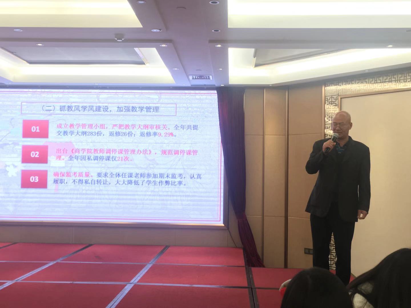 总结大会上,何兴强院长首先作2018年总结报告,他回顾了这一年,我院在具有鲜明特色的专业与学科建设、师资队伍建设、学风建设、校企(产学研)合作、国际教育合作等方面所取得的硕果成绩。他提到,2018年是williamhill中文加强教学质量、教学管理和课程与教材建设,提高人才培养质量,全面启动williamhill中文应用型转型工作的重要阶段,是实施“强优势、补短板、凸特色、凝拳头、集群化发展”的重要一年。他寄望新的一年,williamhill中文将继续以转型发展为工作重心,加大科研与学科、教学与专业等建设力度;凝练特色“专业群”,促进专业协同发展;优化人才培养改革,打造一体化育人体系,脚踏实地、砥砺前行,紧跟我校“出特色、上水平”的办学目标做出贡献。
