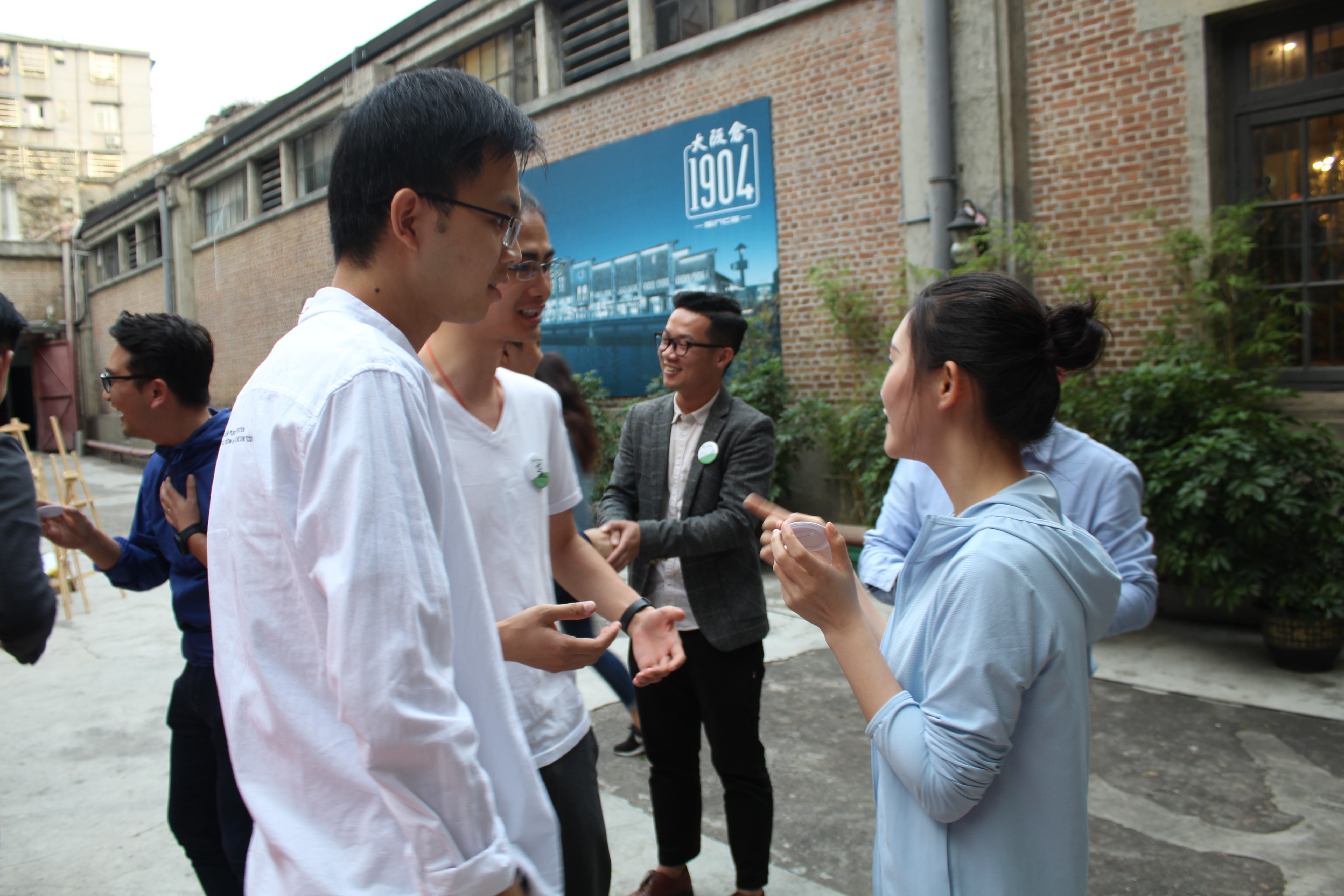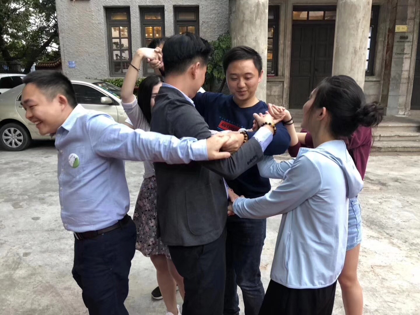 经过一个多小时的研讨会,各位校友移步拍摄大合影后,在会馆门口的空地开展趣味的团建活动,此次活动由校友创办的文旅策划公司组织,有专业的教练组织和指导,校友们分成3组,参与 “交换名字”、“生日排序”、“解手链”、“纸牌屋”等团体游戏。26位校友来自原工商管理系和原经济与商务管理系,从2011届到2018届,彼此不熟悉,通过这次破冰游戏和团建活动,尤其是“解手链”、“纸牌屋”活动需要群策群力,互相配合,互相信赖,大大拉近了校友之间的距离,增强了团体凝聚力。