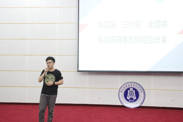 最后,第四届三创赛全国特等奖获得者彭玮先生上台与我们分享一些经验:他指出参赛者不因只用自己的眼光想问题,应该多用企业家的眼光看待问题。同时,我们应该利用好现有的平台,这是一个高的起点,节省了不少成本。彭先生也提到了参赛者应该给予自己更多的自信,自信的形象一定程度上也是企业的一个加分点。他鼓励参赛者无论比赛结果如何也不要放弃三创赛的道路,坚持下去,你也可以是明年的成功者!