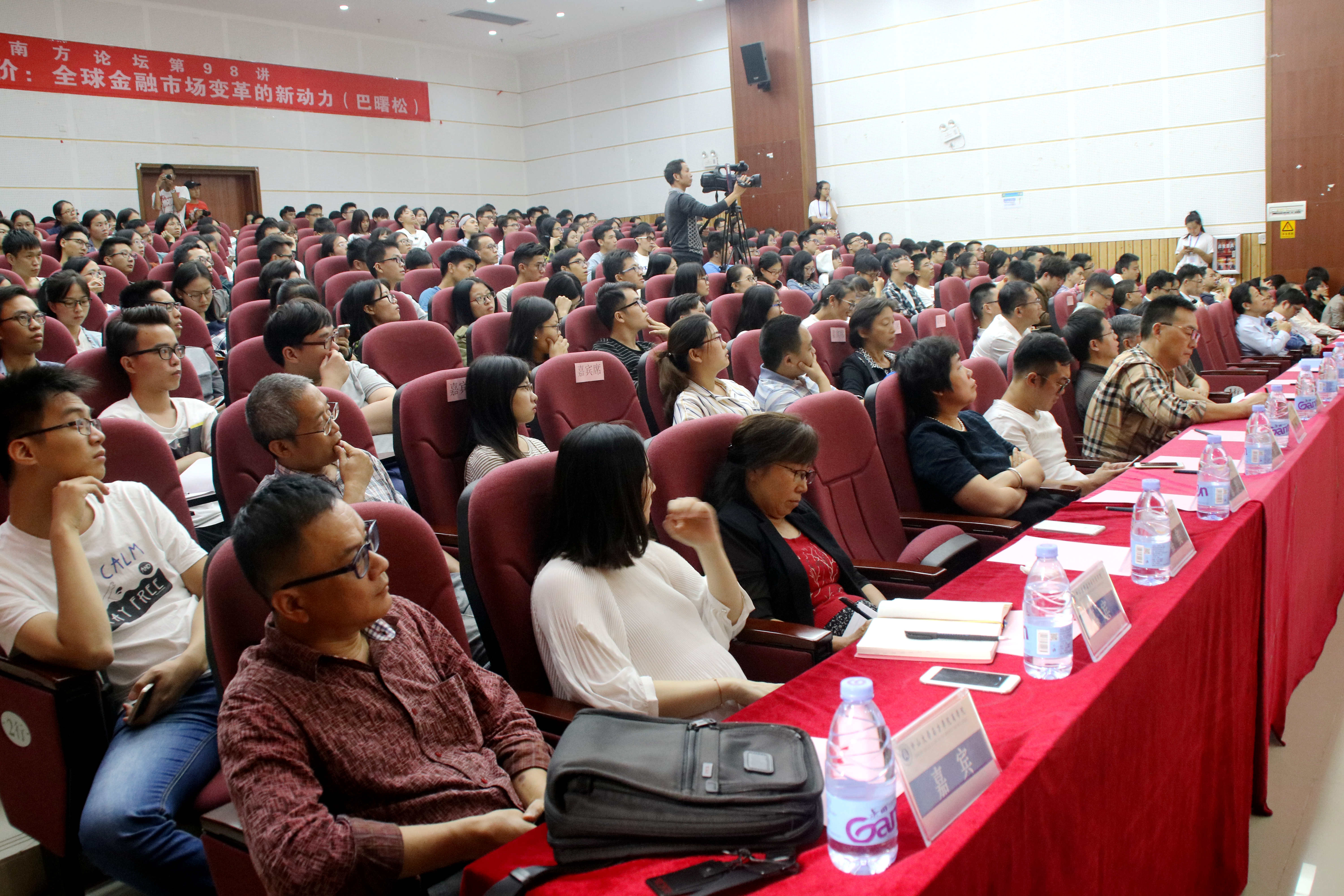 金秋十月,香港交易所首席经济学家、中国银行协会首席经济学家巴曙松教授应邀莅临我校,于10月24日下午3点,为我院师生带来了一场以“为人民币资产定价:全球金融市场变革的新动力”为主题的精彩讲座。此次讲座由williamhill中文承办,招商银行广州分行行长钟德胜、中山大学南方学院党委书记李建超、副校长黄静波、财务总监刘振宏、williamhill中文院长陈功玉、williamhill中文教授廖俊平等校内外各界嘉宾出席了本次讲座。该讲座由中山大学南方学院副校长黄静波教授主持。